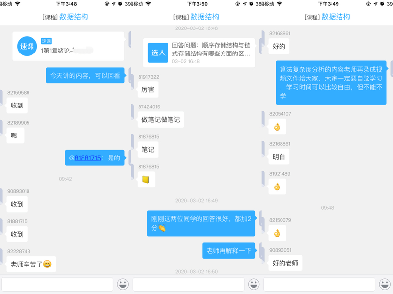 線上教學(xué)不同于線下課堂教學(xué),第一天的網(wǎng)課體驗(yàn),老師們普通反映雖然壓力有點(diǎn)大,操作有些不熟練,但同學(xué)們還是很配合,能積極主動(dòng)提問(wèn)題,參與各種教學(xué)互動(dòng)。老師們希望同學(xué)們能提高自覺性和自主學(xué)習(xí)能力,珍惜線上學(xué)習(xí)的機(jī)會(huì),希望在沒有老師現(xiàn)場(chǎng)監(jiān)督的情況下能積極主動(dòng)完成老師布置的學(xué)習(xí)任務(wù),保證返校后每門課程都能很好地銜接上。