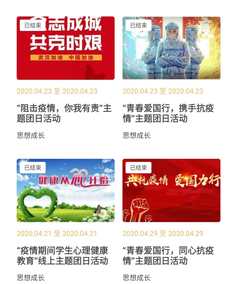 自云端“第二課堂”上線以來(lái),共開(kāi)展活動(dòng)1200余個(gè),參與人次達(dá)45800余次。由校團(tuán)委舉辦思想成長(zhǎng)類活動(dòng)的“抗疫精神”學(xué)習(xí)心得體會(huì)征集,共收集心得體會(huì)1000余份,“抗擊疫情·中國(guó)加油”詩(shī)歌征集活動(dòng),收集作品共300余份。學(xué)生們通過(guò)語(yǔ)言的形式,表達(dá)了對(duì)抗擊疫情的堅(jiān)定信心。