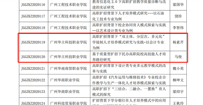 8月21日,廣東省教育廳官網(wǎng)公布《關(guān)于省高職教育教學改革研究與實踐項目高職擴招專項擬立項名單的公示》,我校楊素芹《高職擴招背景下“雙主體、分層次、多元化”學徒制人才培養(yǎng)模式研究與實踐-以會計專業(yè)為例》項目,馬俊《基于質(zhì)量型擴招下民辦高職院校高技能人才培養(yǎng)路徑研究》項目均獲立項。