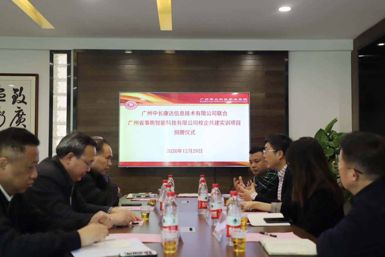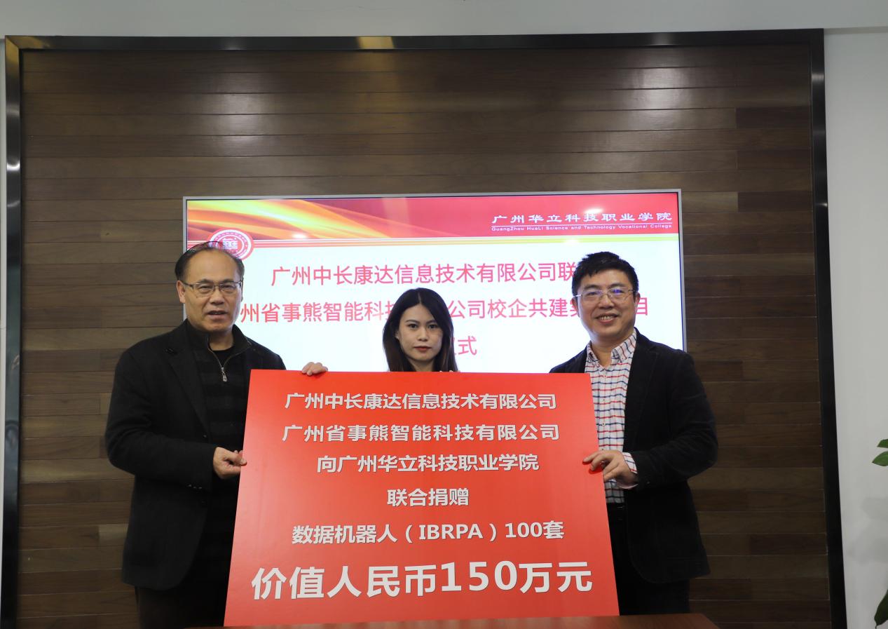 2020年12月29日下午,廣州中長康達信息技術有限公司www.ibrpa.com(以下簡稱“中長康達”)聯(lián)合廣州省事熊智能科技有限公司(以下簡稱“省事熊智能科技”)向我校捐贈了100套價值150萬元的數據機器人(IBRPA)軟件,捐贈儀式在我校行政樓301會議室舉行。