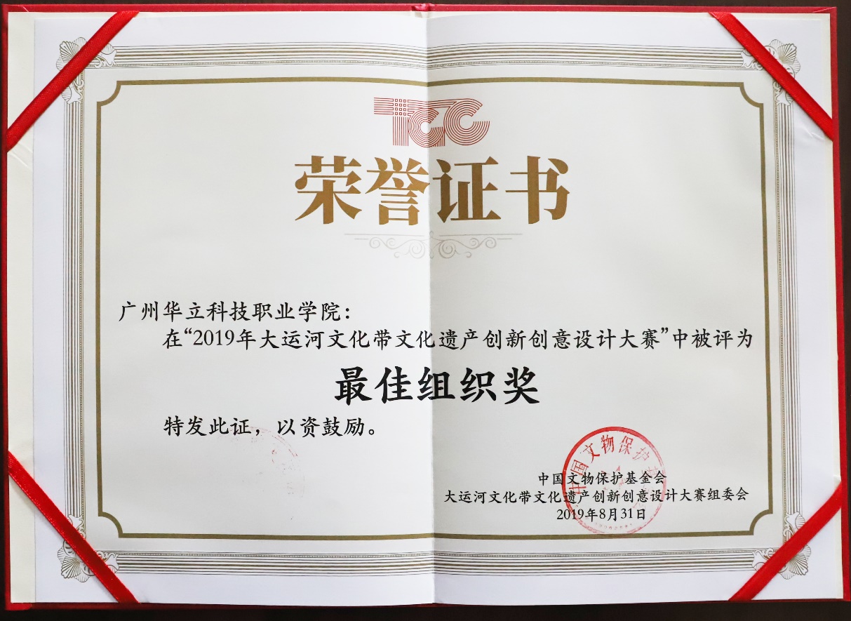 “大運(yùn)河文化帶文化遺產(chǎn)創(chuàng)新創(chuàng)意設(shè)計(jì)大賽”是由國(guó)家文物局指導(dǎo)、中國(guó)文物保護(hù)基金會(huì)主辦的國(guó)家級(jí)文創(chuàng)大賽。2019年8月,山東大學(xué)、廣州華立科技職業(yè)學(xué)院等12家院校及博物館組織工作出色,由大賽組委會(huì)授予最佳組織獎(jiǎng)。