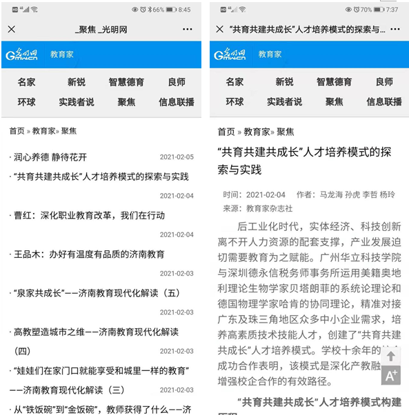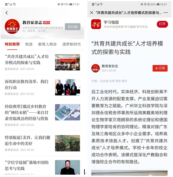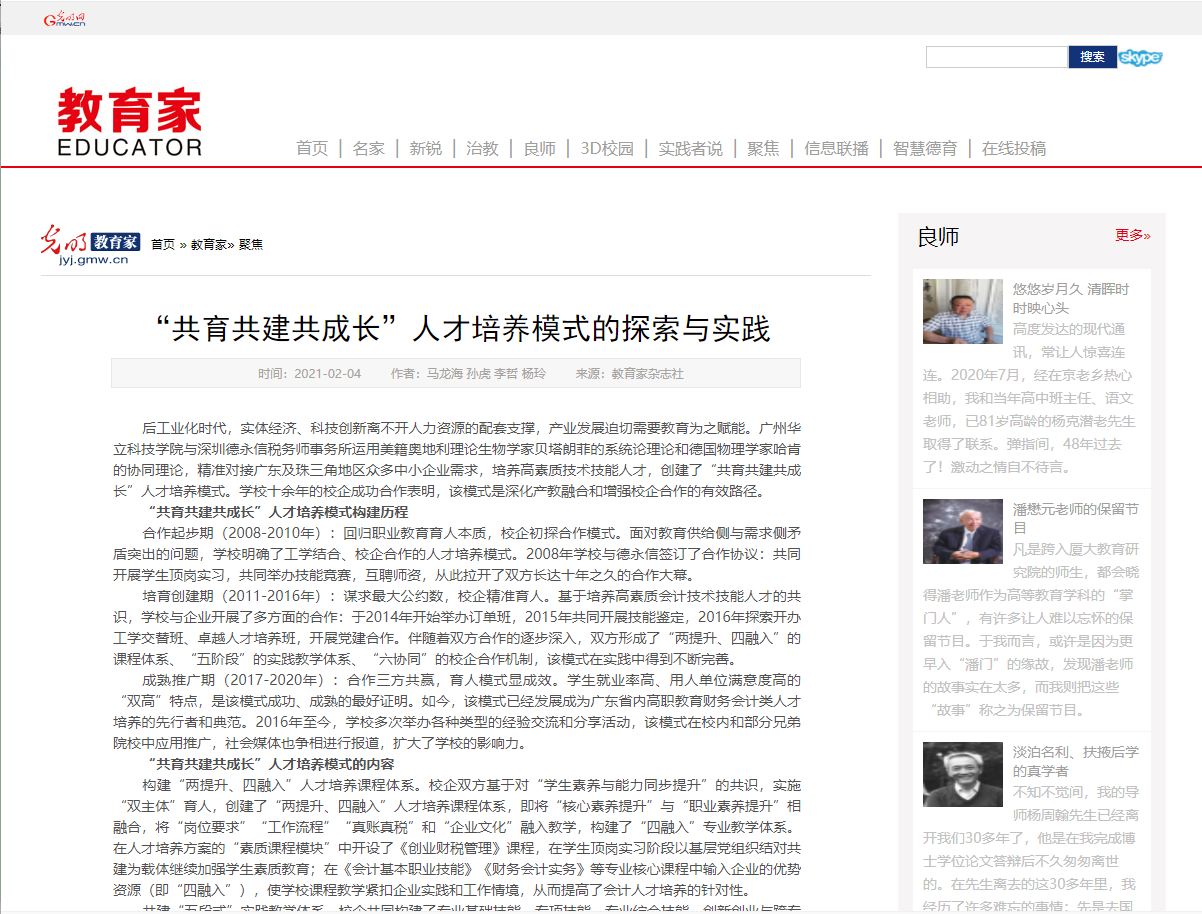 近日,我校會計專業(yè)《“共育共建共成長”人才培養(yǎng)模式的探索與實踐》成功在《教育家》雜志發(fā)表,不僅如此,該文還登上了光明網(wǎng)和“學(xué)習強國”APP。《教育家》雜志由光明日報主管,是中共中央黨報主管的教育主流媒體,其依托《光明日報》在知識界、文化界、教育界、理論界的權(quán)威影響力,致力于打造深度與廣度并重、專業(yè)與內(nèi)涵并包的高端期刊。