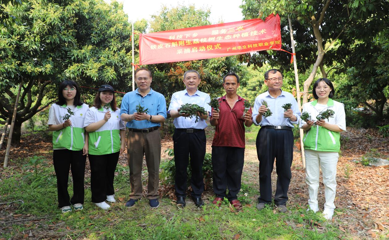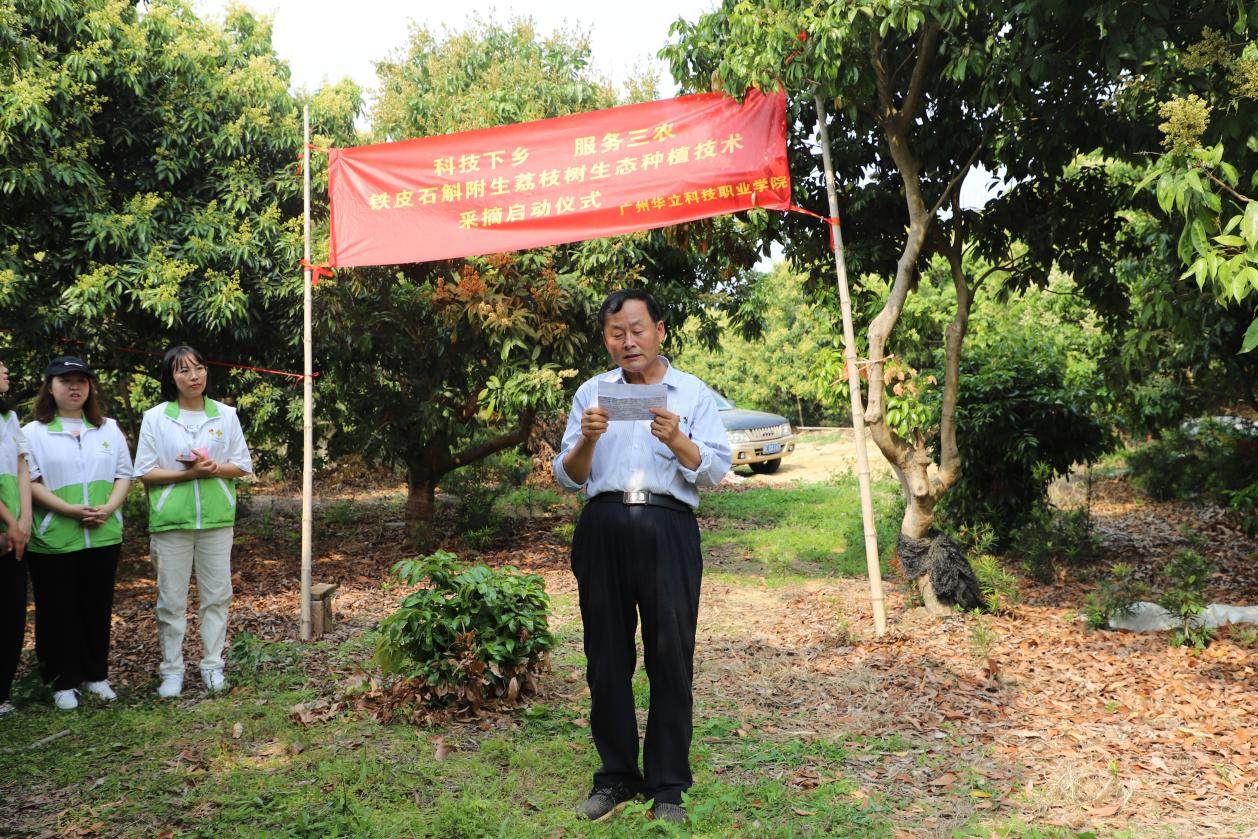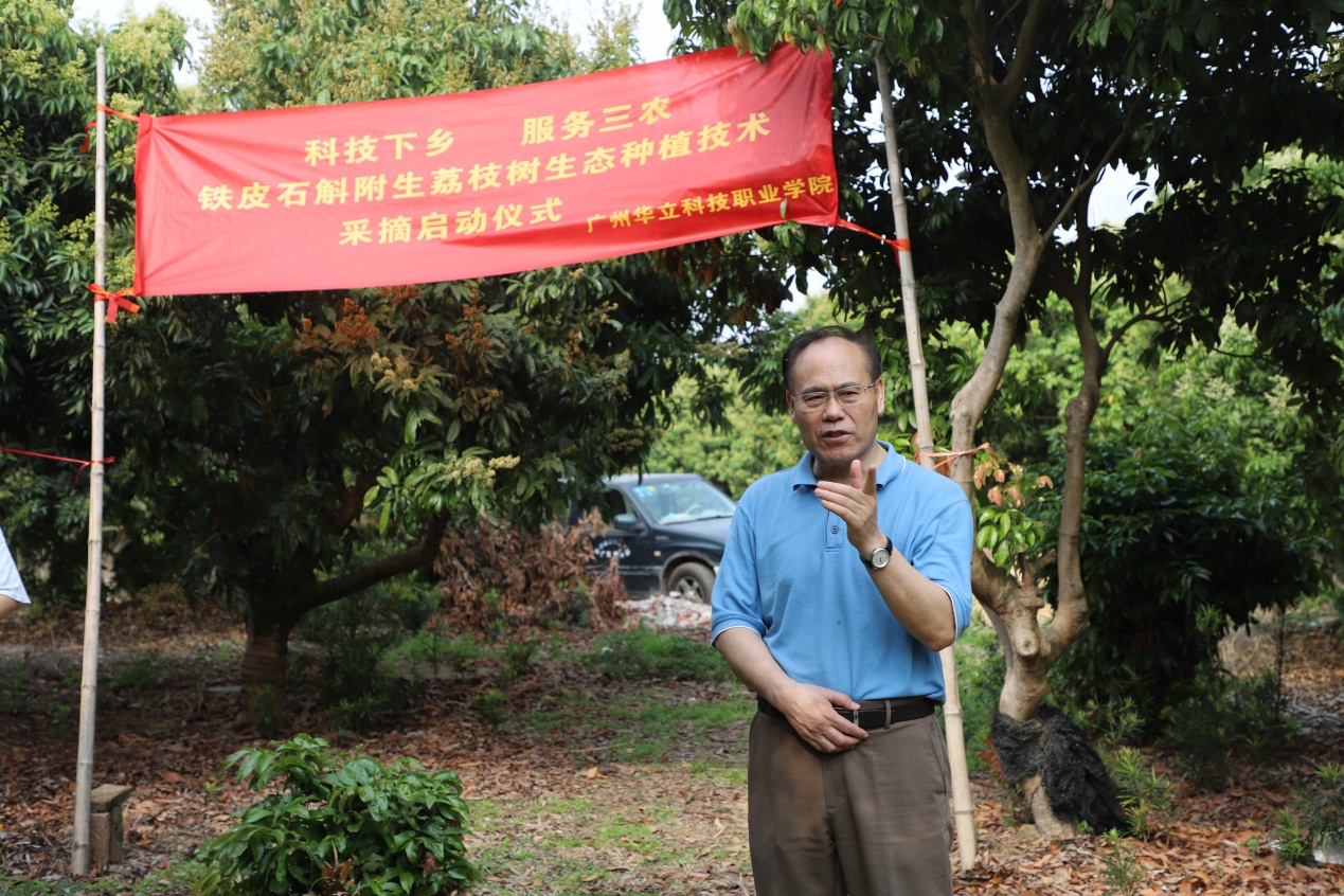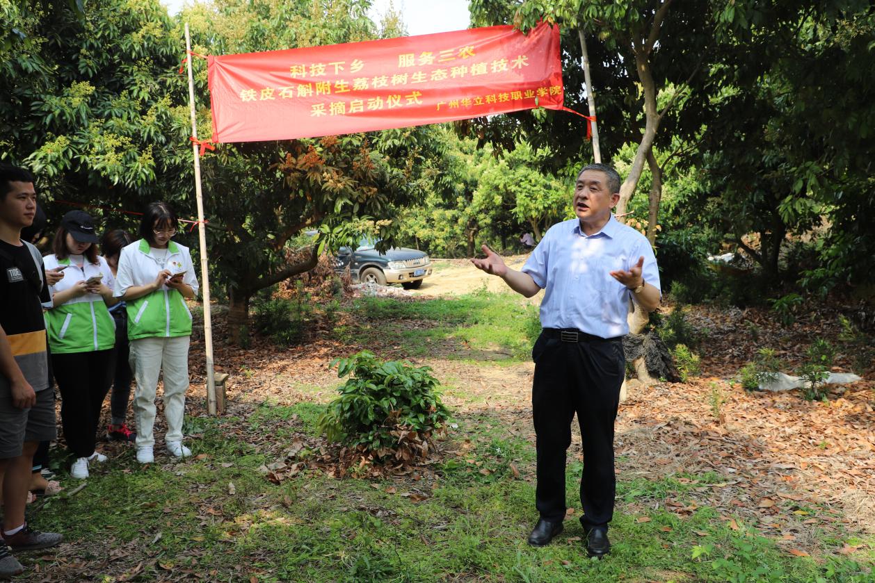 2021年3月18日,廣州華立科技職業(yè)學院校長劉莊教授、執(zhí)行校長馬龍海教授來到了《科技下鄉(xiāng) 服務(wù)三農(nóng) 鐵皮石斛附生荔枝樹生態(tài)種植技術(shù)采摘啟動儀式》的現(xiàn)場,增江街社區(qū)工作服務(wù)站王凡主任、四豐村曾主任出席了采摘儀式,隨行的還有我校會計學院李哲教授,城建學院鄒筱平常務(wù)副院長、國貿(mào)學院隗波揚副院長及部分師生代表。