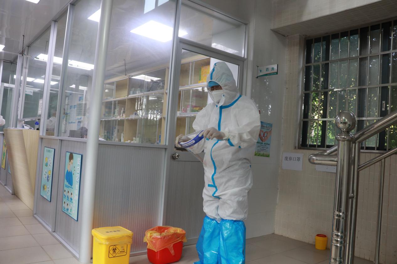 場景三:集中醫(yī)療保障組、學生管理組、場地消殺組等工作人員,進行防護服穿戴示范演練。