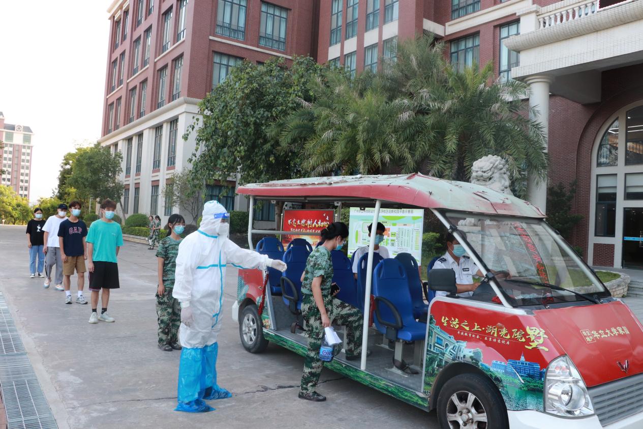 市轉(zhuǎn)移隔離專班安排的轉(zhuǎn)運車輛到達學校,準備分批轉(zhuǎn)移密接者、次密接者和重點人員至隔離酒店。師生登車前,醫(yī)護人員給師生測體溫、指導戴好口罩(糾正不正確的佩戴方式)、詢問癥狀。學校核對全部待轉(zhuǎn)運人員信息確定無誤后,各引導員引導學生有序上車,并按規(guī)定座位間隔坐好。隨車醫(yī)生提醒師生要全程佩戴口罩不要摘下,避免交談,不要串座。校方委派志愿者隨車前往隔離酒店,協(xié)同酒店管理隔離的師生。