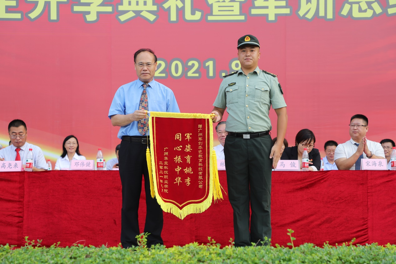 承訓(xùn)部隊向?qū)W校交回軍訓(xùn)團(tuán)團(tuán)旗,馬龍海執(zhí)行校長接旗。學(xué)校向承訓(xùn)部隊贈送錦旗。
