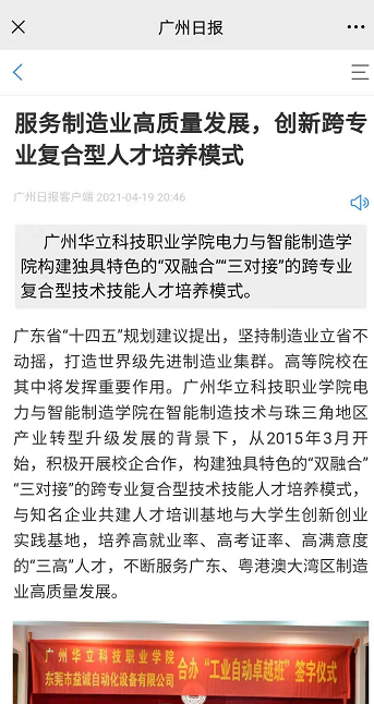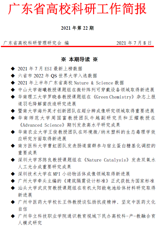 2021年7月8日,由廣東省高??蒲泄芾砭繒斫逃龔d科研處發(fā)布的《廣東省高校科研工作簡報》(2021年第22期)重點報道了我???/span>-產-教融合育人研究成果,同專欄報道的我校是唯一的省內高職院校。