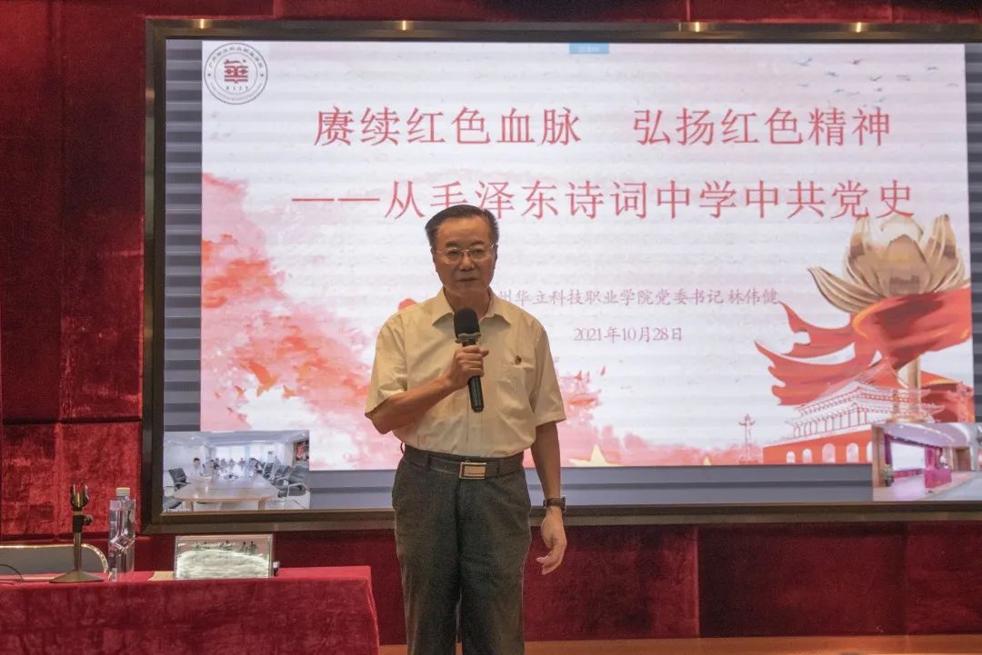 10月28日下午,廣州華立科技職業(yè)學(xué)院黨委書(shū)記林偉健教授在東區(qū)1號(hào)報(bào)告廳講授“思政第一課”,解讀毛主席詩(shī)詞,領(lǐng)悟由建黨精神構(gòu)建的中國(guó)共產(chǎn)黨人的精神譜系及詩(shī)詞中蘊(yùn)含的紅色精神,要求華立學(xué)子秉承革命先輩遺志, 弘揚(yáng)紅色精神,踐行初心使命,樹(shù)立為黨為國(guó)為民永久奮斗、赤誠(chéng)奉獻(xiàn)的堅(jiān)定理想。學(xué)校全體黨務(wù)干部、思政教師、入黨積極分子和學(xué)生參加學(xué)習(xí),云浮校區(qū)師生在線上參加會(huì)議。省教育工委黨史學(xué)習(xí)教育第七巡回指導(dǎo)組成員以視頻方式參會(huì)指導(dǎo)。