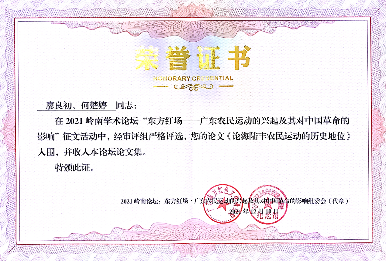 2021年嶺南學(xué)術(shù)論壇:“東方紅場(chǎng)·廣東農(nóng)民運(yùn)動(dòng)的興起及其對(duì)中國(guó)革命的影響”,由廣東省社會(huì)科學(xué)界聯(lián)合會(huì)、廣東南方紅色文化研究院、中山大學(xué)馬克思主義學(xué)院、華南師范大學(xué)馬克思主義學(xué)院、中共汕尾市委黨史研究室等單位聯(lián)合舉辦,目的是深入研究闡釋中國(guó)共產(chǎn)黨百年奮斗的歷史經(jīng)驗(yàn)和智慧,進(jìn)一步推動(dòng)廣東革命史研究,助力革命老區(qū)蘇區(qū),加快振興發(fā)展。本次學(xué)術(shù)論壇自2021年8月19日發(fā)出征文通知至11月5日截止,共收到全省各高校、省社科研究機(jī)構(gòu)、省黨史研究部門等研究人員提交的學(xué)術(shù)論文131篇。研究會(huì)論文專家評(píng)審小組采用匿名方式,經(jīng)過“查重”、匿名審讀、終評(píng)審定等環(huán)節(jié),最后評(píng)出62篇優(yōu)秀論文入圍,并編輯成冊(cè)。我校廖良初、何楚婷兩位老師合寫的“論海陸豐農(nóng)民運(yùn)動(dòng)的歷史地位”,被評(píng)為優(yōu)秀入圍論文,并編入大會(huì)論文集進(jìn)行交流。