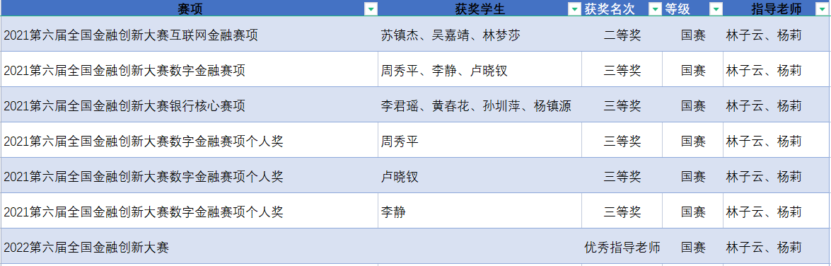 近日,第六屆全國大學生金融創(chuàng)新大賽總決賽圓滿落幕。我校云浮校區(qū)共3組參賽團隊、10名同學獲獎。其中,林子云、楊莉老師指導的蘇鎮(zhèn)杰、吳嘉靖、林夢莎同學團隊獲得大賽互聯(lián)網(wǎng)金融賽項二等獎。李君瑤、黃春花、孫圳萍、楊鎮(zhèn)源同學團隊和李靜、周秀平、盧曉釵同學團隊分別獲得“數(shù)字金融”和“銀行核心”賽項的三等獎;李靜、周秀平、盧曉釵三位同學獲數(shù)字金融賽項個人三等獎;林子云、楊莉老師獲“優(yōu)秀指導老師”獎。