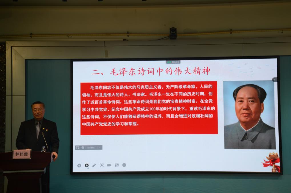 林偉健書記以《弘揚紅色精神 煥發(fā)青春熱情—從毛澤東詩詞中學(xué)中共黨史》為題,重點圍繞“偉大建黨精神構(gòu)建起了中國共產(chǎn)黨人的精神譜系”、“毛澤東詩詞中的偉大精神”、“偉人的風(fēng)采和情懷,激勵著我們奮進新時代”三個方面展開,通過對毛主席詩詞的解讀和賞析,讓大家從毛主席詩詞的創(chuàng)作背景、詩歌內(nèi)容、思想內(nèi)涵等方面,一起重溫黨的光輝歷史和豐功偉績,領(lǐng)略共產(chǎn)黨人的理想信念和初心使命,體悟先賢們深厚的愛國情懷和勇敢的責(zé)任擔(dān)當(dāng)。林書記以平實親切的語言,鏗鏘有力的語調(diào),向同學(xué)們娓娓道來中國共產(chǎn)黨一路走來篳路藍縷的艱辛歷程,引導(dǎo)從紅色詩詞中感悟中國共產(chǎn)黨的百年奮斗歷程,深入領(lǐng)會中國共產(chǎn)黨人的革命精神與革命斗志,讓紅色詩詞激蕩心靈,堅定新時代青年學(xué)生的理想信念,樹立遠大理想;厚植愛國情懷,筑牢信仰之基。