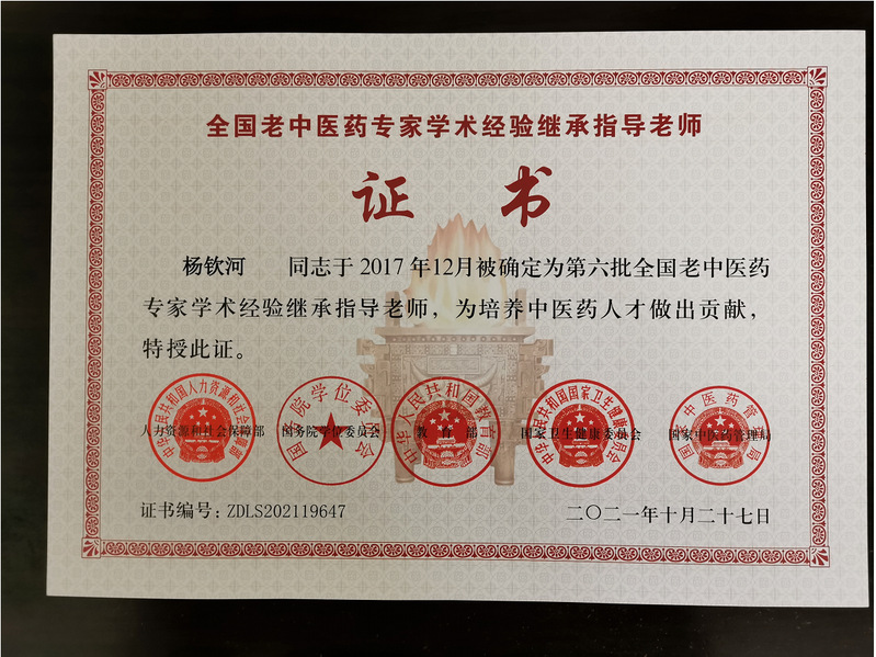 近日,我校中醫(yī)藥學院院長楊欽河教授榮獲國家五部委聯(lián)合頒發(fā)的“第六批全國老中醫(yī)藥專家學術經(jīng)驗繼承指導老師”證書。這是我校首位獲得中醫(yī)藥類國家級榮譽的教師。楊教授多年來堅持教學、科研和臨床工作并重,為中醫(yī)藥人才培養(yǎng)作出了積極貢獻,已培養(yǎng)博士、碩士和博士后65名,學術傳承人2名;指導在讀博士生、碩士生17名,博士后6名,學術傳承人8名。先后主持包括6項國家自然科學基金面上項目等多項國家省部廳局級科研教學資助課題,在國內(nèi)外發(fā)表學術論文200余篇,其中以第一或通訊作者發(fā)表SCI論文30余篇;獲廣東省科技進步二等獎1項(第一完成人)、三等獎和中醫(yī)藥科技進步一等獎各1項(第四完成人)。在臨床上擅長運用中醫(yī)藥、中西醫(yī)結合理論和方法診治慢性肝膽病、脂代謝病、胃腸疾病及呼吸道系統(tǒng)和泌尿系疾病等各科疑難病癥,是學驗具豐的老中醫(yī)藥專家。
