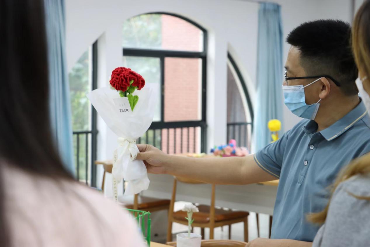 師生在欣賞“母親節(jié)”主題手工作品