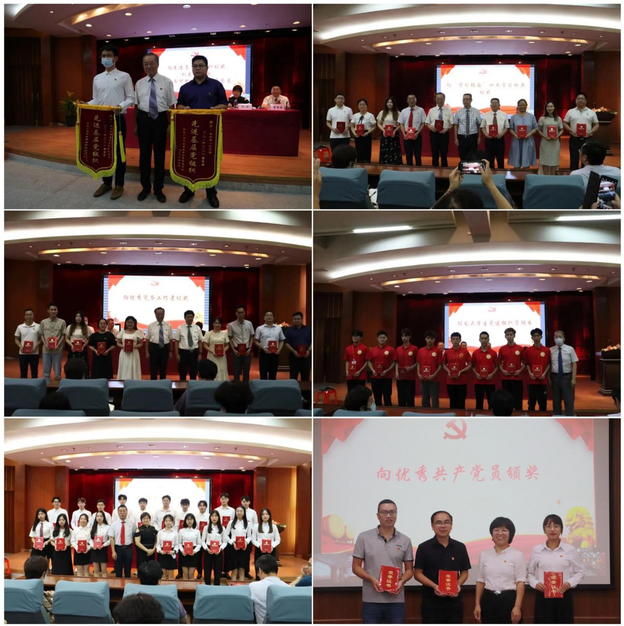 學(xué)校領(lǐng)導(dǎo)為受表彰的先進(jìn)基層黨組織和個(gè)人頒獎(jiǎng),為學(xué)生黨建組織員頒發(fā)聘書。