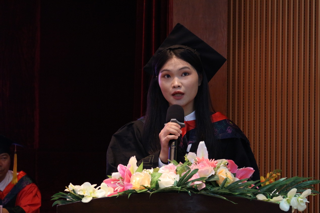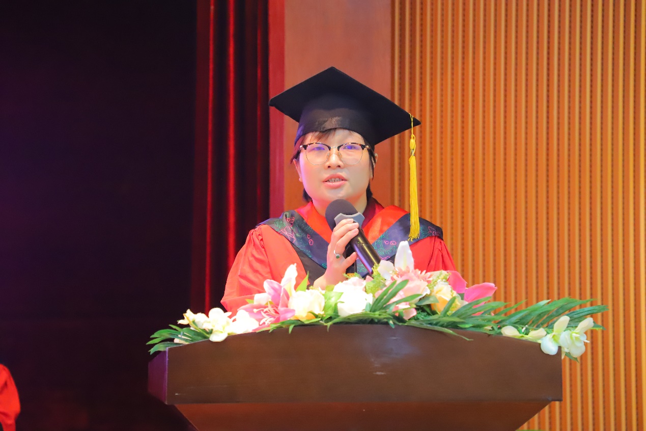 藝術(shù)與傳媒學(xué)院梁寶怡同學(xué)代表2022屆全體畢業(yè)生進(jìn)行發(fā)言。她說(shuō)到,感謝學(xué)校的悉心栽培,為同學(xué)們的發(fā)展提供的諸多平臺(tái)和展示的機(jī)會(huì),讓自己在大學(xué)三年里得到了全方面的成長(zhǎng)。表示自己會(huì)一直銘記“厚德 強(qiáng)能 務(wù)實(shí) 創(chuàng)新”的校訓(xùn),并身體力行。青春激昂的發(fā)言贏得了現(xiàn)場(chǎng)雷鳴般的掌聲。