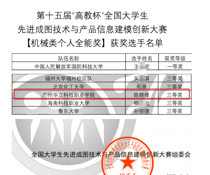 今年5月份,我校陳曉鋒、林梓康、吳世濤、倪子逸、劉應(yīng)度五位學(xué)子組成的競賽團(tuán)隊參加了廣東省預(yù)選賽,均獲省賽個人三等獎,廣州華立科技職業(yè)學(xué)院榮獲省賽團(tuán)體獎三等獎,成為大賽榮獲團(tuán)體獎的唯一民辦高職院校。陳曉鋒、吳世濤兩位同學(xué)獲得參加國賽資格。最終,陳曉鋒同學(xué)憑借出色的發(fā)揮,榮獲國賽機(jī)械類個人全能獎三等獎,實現(xiàn)我校在該項國賽上的歷史性突破!