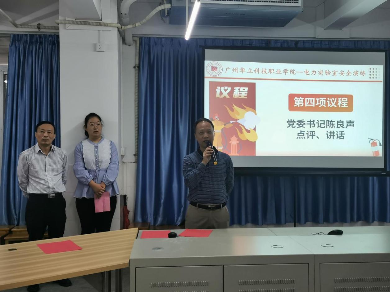 演練結(jié)束后,副校長高堯來強(qiáng)調(diào)實(shí)驗(yàn)室安全工作是我們校園安全工作的一部分,要高度重視,以此次演練活動(dòng)為契機(jī),強(qiáng)化實(shí)驗(yàn)室安全教育體系建設(shè),有針對(duì)性地進(jìn)行實(shí)驗(yàn)室安全演練和培訓(xùn)活動(dòng),有效預(yù)防和遏制實(shí)驗(yàn)室事故的發(fā)生。接著由黨委書記陳良聲為此次電力實(shí)驗(yàn)室安全演練作總結(jié),他認(rèn)為本次演練達(dá)到了預(yù)期效果,要切實(shí)加強(qiáng)校園安全,把安全穩(wěn)定作為最大的政治責(zé)任,妥善處理各種風(fēng)險(xiǎn)隱患,并強(qiáng)調(diào)實(shí)驗(yàn)室安全是校園安全的重要內(nèi)容,學(xué)校安全事關(guān)師生生命財(cái)產(chǎn)、事關(guān)家庭幸福安康、事關(guān)學(xué)??茖W(xué)發(fā)展、事關(guān)社會(huì)和諧穩(wěn)定、事關(guān)國家長治久安。他希望學(xué)校各部門、各單位樹立安全發(fā)展理念,弘揚(yáng)生命至上、安全第一思想,努力做到人人講安全、事事為安全、時(shí)時(shí)想安全、處處要安全,凝神聚力建設(shè)更高水平的安全文明校園,共同為全校師生的學(xué)習(xí)工作生活、為學(xué)校的高質(zhì)量發(fā)展?fàn)I造平安祥和的校園環(huán)境。
