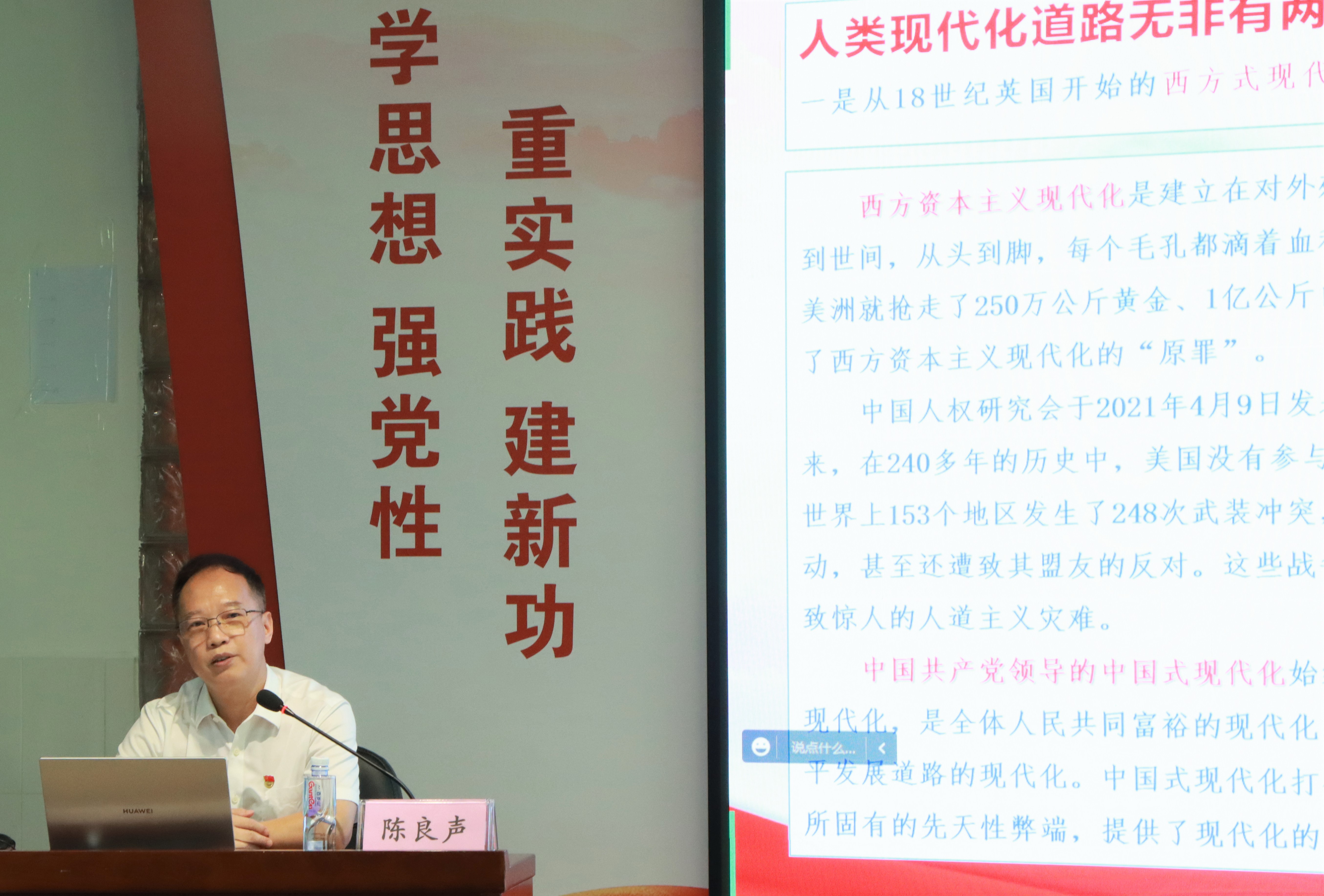 學(xué)習(xí)會圍繞“中國式現(xiàn)代化的探索歷程、中國式現(xiàn)代化的基本內(nèi)涵、中國式現(xiàn)代化的重要特征、中國式現(xiàn)代化的本質(zhì)要求、中國式現(xiàn)代化的戰(zhàn)略支撐和黨建創(chuàng)優(yōu)推動高質(zhì)量發(fā)展”六個方面展開。陳良聲以寬廣深邃的大歷史觀,對中國式現(xiàn)代化進(jìn)行了深入解讀、深刻闡釋。結(jié)合大量數(shù)據(jù)和史實(shí),從中國式現(xiàn)代化的探索歷程、中國特色、本質(zhì)要求、戰(zhàn)略支撐等方面,全面、系統(tǒng)、科學(xué)地闡釋了中國式現(xiàn)代化的基本理論,充分展示了中國式現(xiàn)代化的宏大時代場景和戰(zhàn)略頂層設(shè)計。