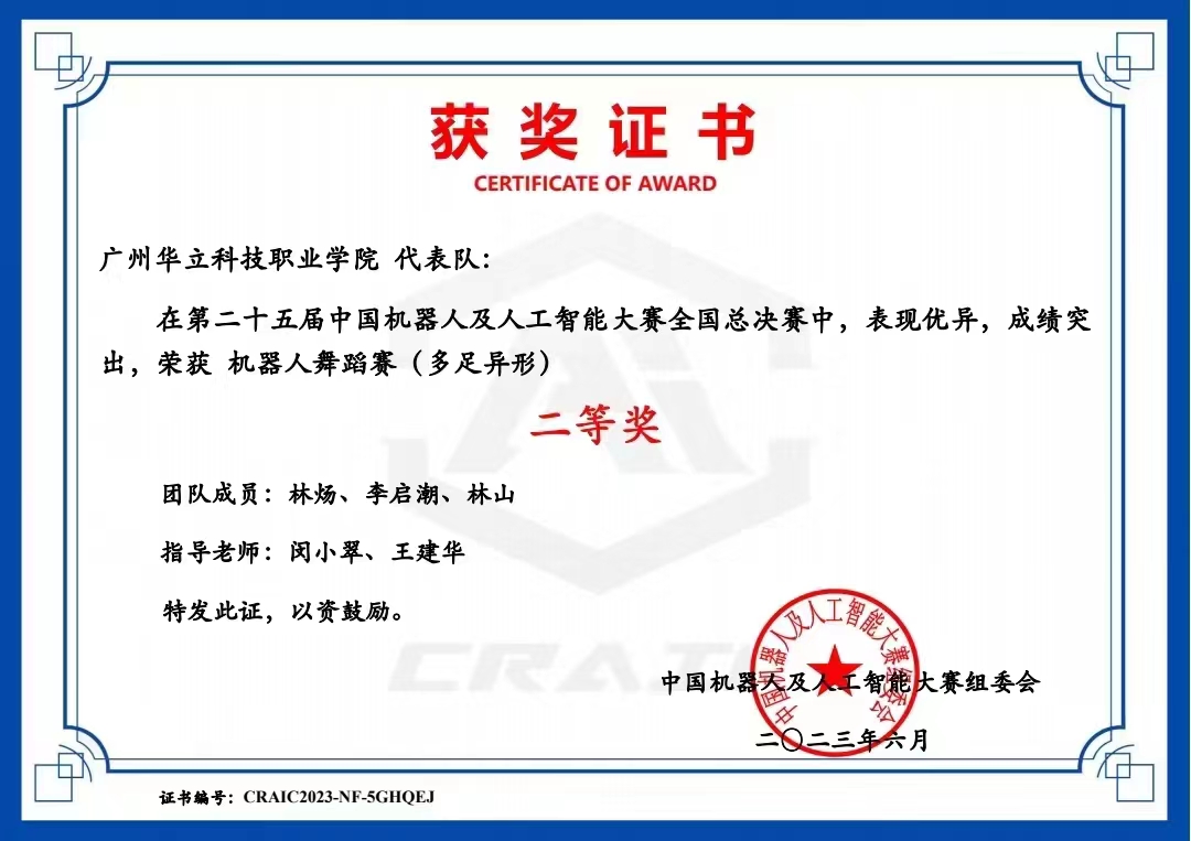 近日,廣州華立科技職業(yè)學(xué)院計(jì)算機(jī)信息工程學(xué)院的學(xué)生在第二十五屆中國(guó)機(jī)器人及人工智能大賽比中取得優(yōu)異成績(jī)。經(jīng)廣州華立科技職業(yè)學(xué)院的組織和指導(dǎo),其中由計(jì)算機(jī)信息工程學(xué)院王建華院長(zhǎng)和閔小翠主任指導(dǎo)的學(xué)生團(tuán)隊(duì)分別獲得了省級(jí)一等獎(jiǎng)和二等獎(jiǎng)并晉級(jí)全國(guó)決賽,學(xué)生團(tuán)隊(duì)在決賽中展現(xiàn)出優(yōu)秀的機(jī)器人技術(shù)和團(tuán)隊(duì)合作能力,最終斬獲兩個(gè)全國(guó)二等獎(jiǎng)。