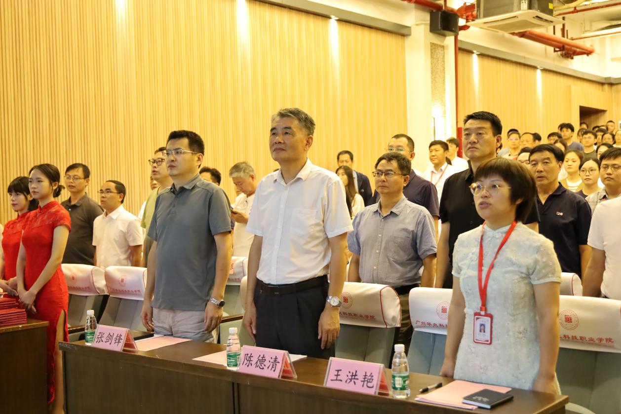 9月7日下午,在第39個(gè)教師節(jié)到來之際,廣州華立科技職業(yè)學(xué)院“躬耕教壇,強(qiáng)國有我”教師節(jié)表彰大會(huì)和2023年師德建設(shè)主題教育月活動(dòng)啟動(dòng)儀式采用兩校區(qū)視頻連線的方式,分別在廣州校區(qū)1號(hào)報(bào)告廳和云浮校區(qū)圖書館禮堂同步舉行。學(xué)校工會(huì)主席、常務(wù)副校長(zhǎng)馬俊主持大會(huì)。