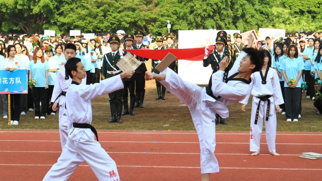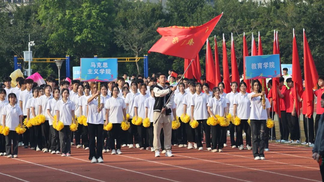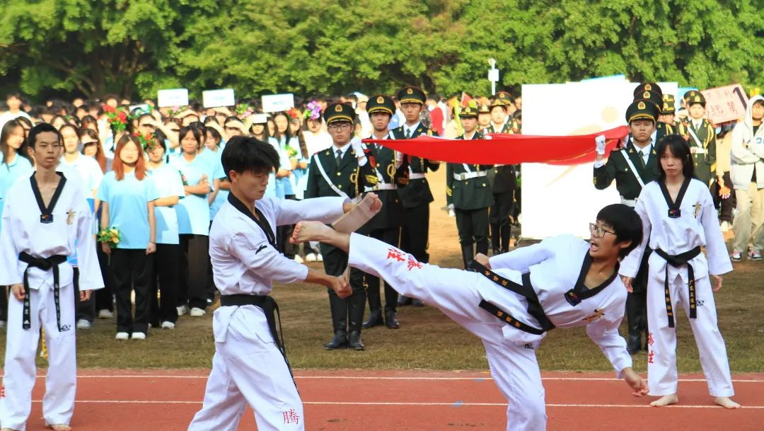 開幕式上,國旗護衛(wèi)隊、鮮花方隊、紅旗方隊、機關(guān)教師代表隊、各二級學院師生代表隊、志愿者方隊和裁判員方隊伴隨著歡樂的音樂依次入場?;⒒⑸L的旗幟、鏗鏘有力的步伐、響徹云霄的口號,充分展現(xiàn)了全校師生自強自信、拼搏奮進、團結(jié)向上、樂觀積極的精神風貌。最后,國防教育協(xié)會、跆拳道協(xié)會、街舞協(xié)會的精彩表演將開幕式推向了高潮。