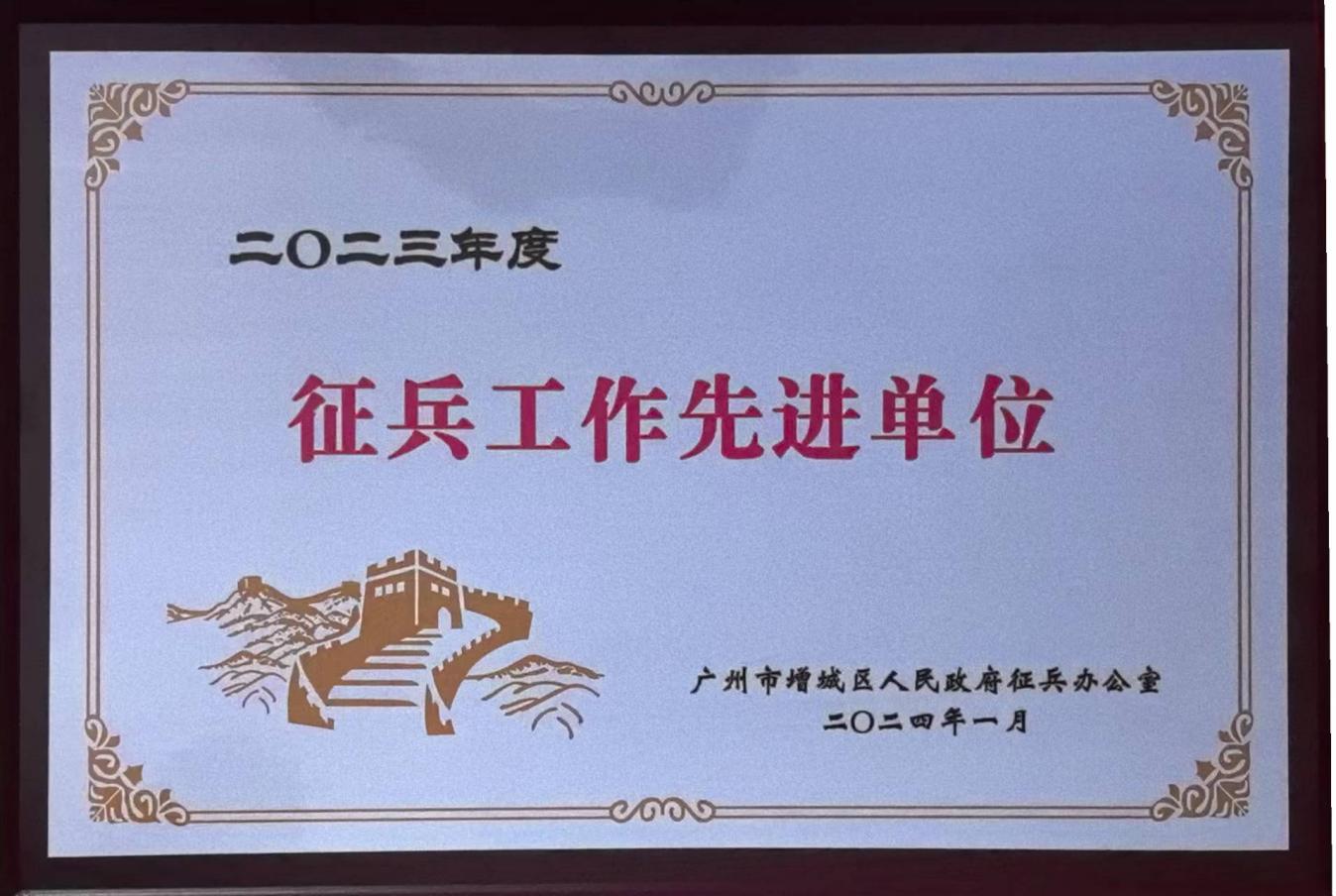 廣州市增城區(qū)人民政府征兵辦公室頒發(fā)的“征兵工作先進(jìn)單位”牌匾