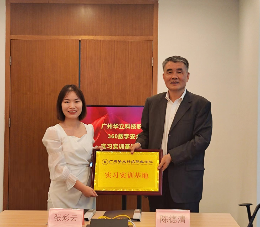 隨后,舉行實踐教學基地簽約儀式。陳德清校長代表學校授予360公司廣州華立科技職業(yè)學院實習實訓基地牌匾。雙方將以此次交流和簽約為契機,為下一步深度合作打下堅實基礎,為學生實習就業(yè)搭建更好的平臺。