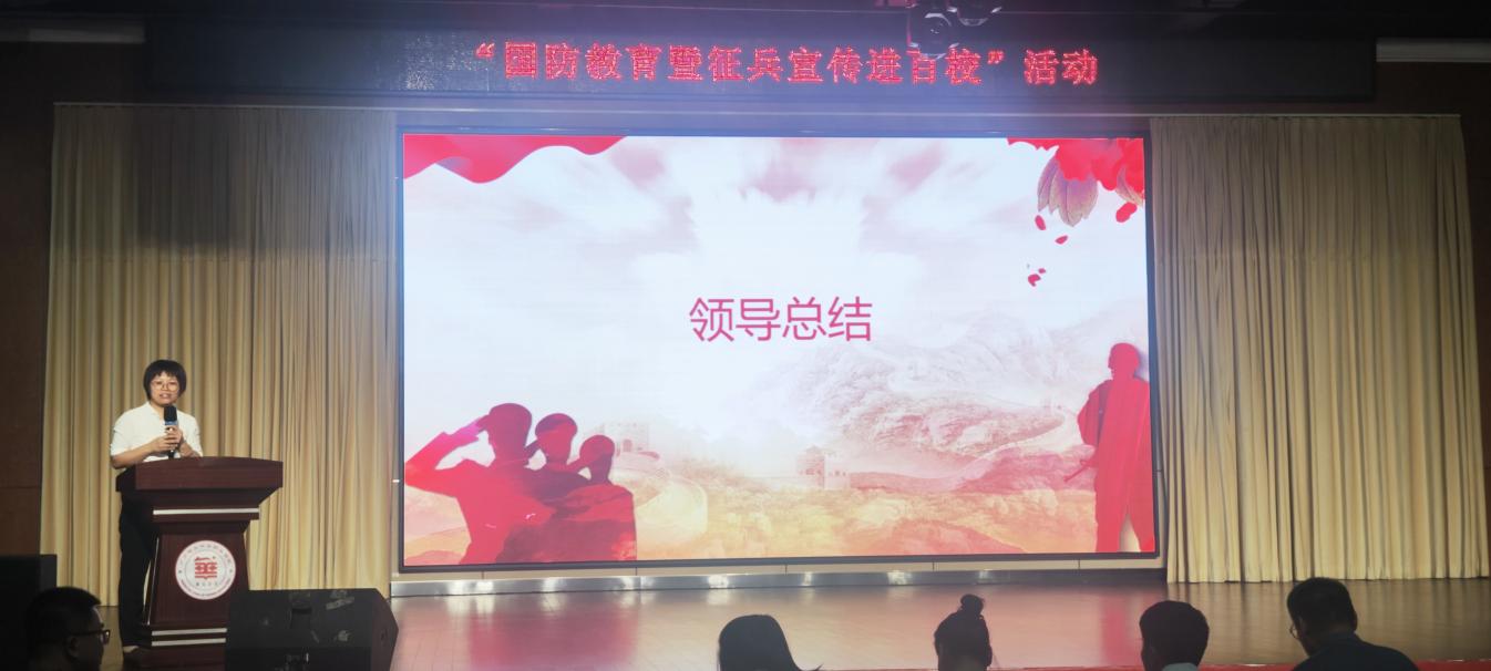宣講內(nèi)容結(jié)束后,由王洪艷副校長對此次活動進行總結(jié)。王校表示此次校地共建“國防教育暨征兵宣傳進百?!毙v活動結(jié)合了我國安全形勢的新變化與發(fā)展趨勢,給在場師生們上了一堂精彩的國防教育暨征兵宣傳課,更好地動員廣大青年學(xué)生積極參軍入伍,為國防事業(yè)貢獻力量。