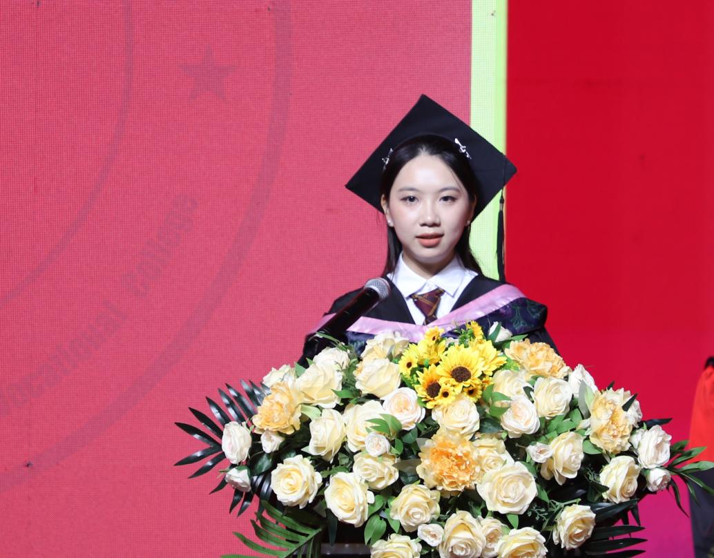 經(jīng)管學(xué)院的黃瑩瑩同學(xué)代表2024屆全體畢業(yè)生進(jìn)行發(fā)言,對(duì)關(guān)切師生的領(lǐng)導(dǎo),和認(rèn)真教學(xué)、辛勤教課的所有老師們,表示了衷心的感謝和崇高的敬意!表示自己一定會(huì)努力成為有理想、有道德、有文化、守紀(jì)律的合格畢業(yè)生,給社會(huì)、給學(xué)校、給家人交一份滿意的答卷。最后,送上了誠(chéng)摯的祝福,衷心祝愿母校蓬勃發(fā)展,再譜華章,祝愿老師們碩果累累、桃李滿園,祝愿同學(xué)們一帆風(fēng)順,前程似錦!