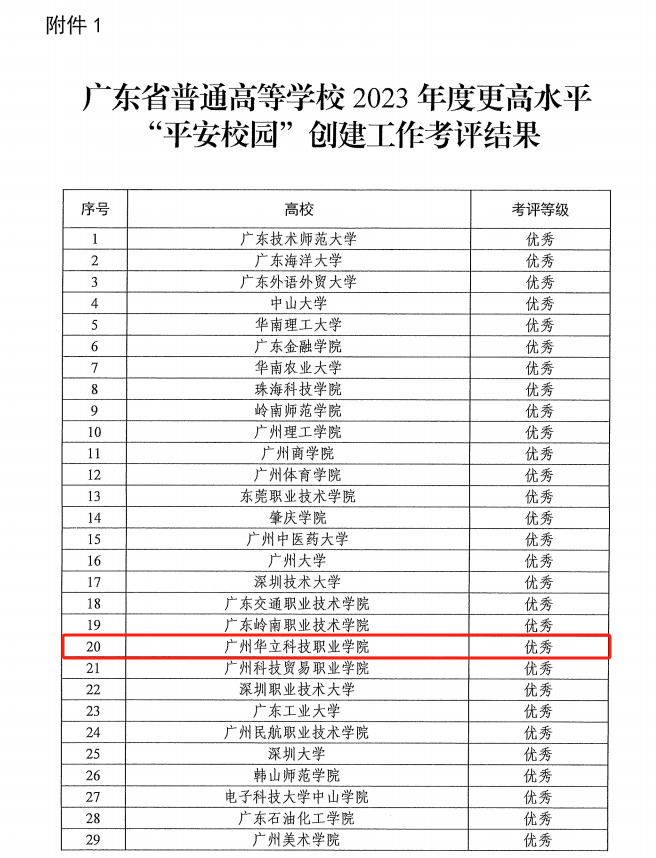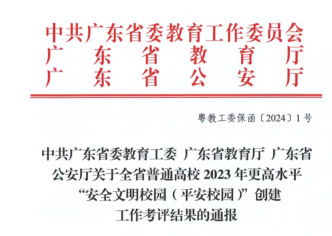 近日,中共廣東省委教育工委、廣東省教育廳、廣東省公安廳聯(lián)合發(fā)布了《關(guān)于全省普通高校2023年更高水平“安全文明校園(平安校園)”創(chuàng)建工作考評(píng)結(jié)果的通報(bào)》(粵教工委保函〔2024〕1號(hào))文件,我校在全省160所高校中名列前茅,考評(píng)結(jié)果為優(yōu)秀,在考評(píng)結(jié)果為優(yōu)秀的55所高校中位列20,這是對(duì)我校教育事業(yè)發(fā)展和學(xué)校安全工作的重要肯定。