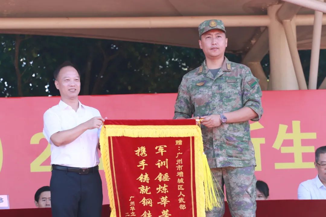 承訓(xùn)部隊領(lǐng)導(dǎo)向?qū)W校交軍訓(xùn)團團旗,陳良聲書記和高堯來副書記分別接軍訓(xùn)團團旗并向承訓(xùn)部隊贈送錦旗,向長期以來關(guān)心支持我校軍訓(xùn)工作的承訓(xùn)部隊表示衷心的感謝!