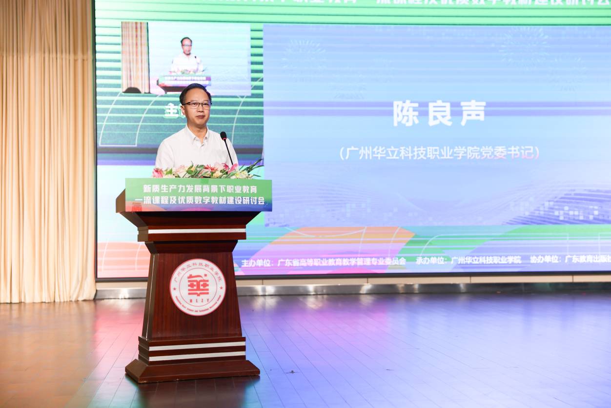 陳良聲書(shū)記代表承辦方廣州華立科技職業(yè)學(xué)院致辭。陳良聲書(shū)記向與會(huì)的專家、領(lǐng)導(dǎo)表示衷心感謝,并向參會(huì)的來(lái)賓致以熱烈歡迎。他簡(jiǎn)要介紹了學(xué)校的創(chuàng)建歷史以及顯著成績(jī),展現(xiàn)了學(xué)校的辦學(xué)實(shí)力和水平。陳書(shū)記指出,本次廣東省“新質(zhì)生產(chǎn)力發(fā)展背景下職業(yè)教育一流課程及優(yōu)質(zhì)數(shù)字教材建設(shè)”研討會(huì),抓的就是職業(yè)教育教學(xué)改革的深處和實(shí)處。他強(qiáng)調(diào),眾多專家云集華立,使學(xué)校滿園蓬蓽生輝,研討會(huì)將極大推動(dòng)學(xué)校對(duì)新質(zhì)生產(chǎn)力的理解以及一流課程和優(yōu)質(zhì)數(shù)字教材的建設(shè),并預(yù)祝研討會(huì)取得圓滿成功。