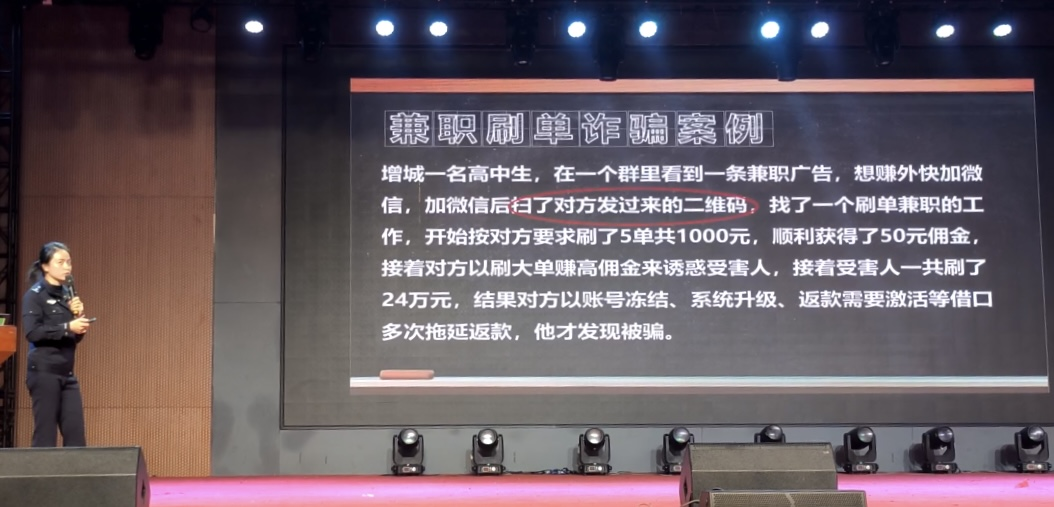 講座中,主講王警官結(jié)合近年來(lái)高校內(nèi)高發(fā)的電信網(wǎng)絡(luò)詐騙案例,重點(diǎn)圍繞投資詐騙、刷單詐騙、購(gòu)物詐騙、游戲裝備詐騙等四類(lèi)常見(jiàn)詐騙類(lèi)型,進(jìn)行了深入淺出的講解。他通過(guò)真實(shí)案例剖析、詐騙手段揭秘以及防范技巧分享,生動(dòng)形象地向師生們展示了詐騙分子的慣用伎倆和話術(shù),提醒大家時(shí)刻保持警惕,切勿輕信陌生電話、短信或網(wǎng)絡(luò)信息。