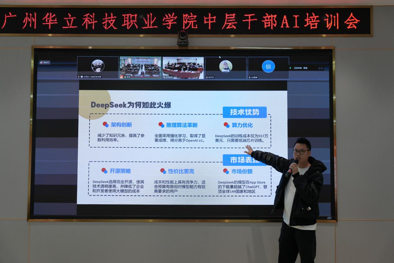 2025年3月6日,為全面貫徹黨的二十大關(guān)于“推動(dòng)教育數(shù)字化發(fā)展”的戰(zhàn)略要求,積極響應(yīng)教育部《教育信息化2.0行動(dòng)計(jì)劃》及《廣東省數(shù)字政府改革建設(shè)“十四五”規(guī)劃》的相關(guān)部署,廣州華立科技職業(yè)學(xué)院在廣州校區(qū)圖書館104組織開展校領(lǐng)導(dǎo)、中層干部“Deepseek深度應(yīng)用打造教師最得力的助手”專題培訓(xùn),云浮校區(qū)以視頻連線參會(huì)。此次培訓(xùn)聚焦人工智能技術(shù)在教育管理場(chǎng)景中的深度應(yīng)用,旨在通過(guò)工具實(shí)操與思維革新雙輪驅(qū)動(dòng),全面提升管理隊(duì)伍的數(shù)字素養(yǎng)與創(chuàng)新能力,為學(xué)校高質(zhì)量發(fā)展注入新動(dòng)能。