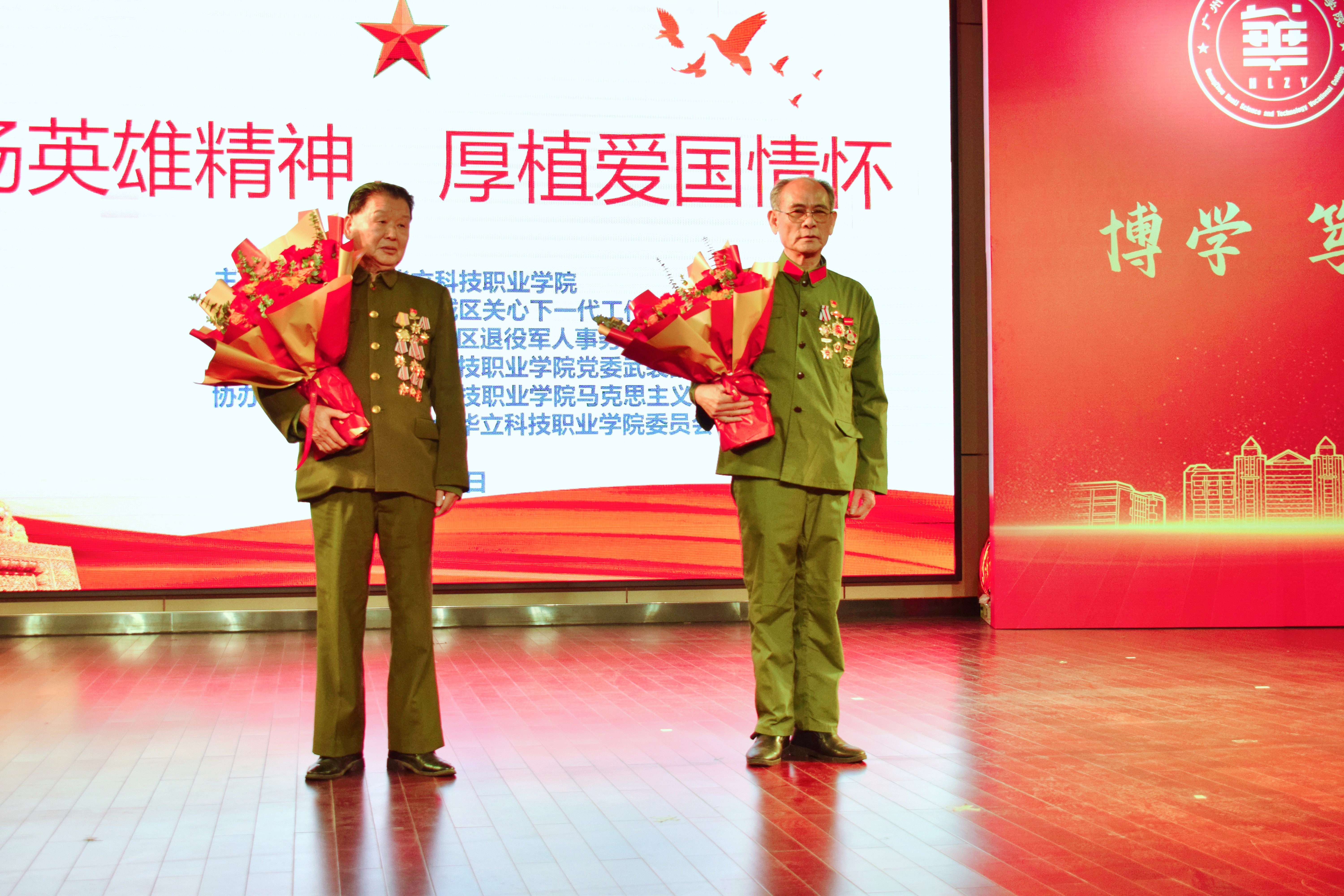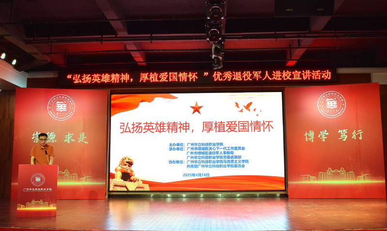 4月16日下午,我校在圖書館8樓報告廳舉辦了“弘揚(yáng)英雄精神,厚植愛國情懷”優(yōu)秀退役軍人進(jìn)校宣講活動。此次活動由廣州華立科技職業(yè)學(xué)院主辦、廣州市增城區(qū)關(guān)心下一代工作委員會、廣州市增城區(qū)退役軍人事務(wù)局與廣州華立科技職業(yè)學(xué)院武裝部聯(lián)合承辦,廣州華立科技職業(yè)學(xué)院黨委副書記、副校長王洪艷、黨委武裝部部長陳勝軍、馬克思主義學(xué)院院長廖良初、團(tuán)委書記張超越、廣州市增城區(qū)退役軍人事務(wù)局服務(wù)中心主任顧翎、廣州市增城區(qū)退役軍人事務(wù)局九級職員陳艷、廣州市增城區(qū)增江街退役軍人服務(wù)站工作人員陳子晴、廣州松田職業(yè)學(xué)院黨委武裝部副部長曹文豪以及來自增城區(qū)的兩位優(yōu)秀退役軍人代表、學(xué)校各二級學(xué)院學(xué)管主任等領(lǐng)導(dǎo)和嘉賓出席了活動?;顒釉谇f嚴(yán)的國歌中拉開序幕,學(xué)校國旗護(hù)衛(wèi)隊(duì)隊(duì)員護(hù)送國旗入場。