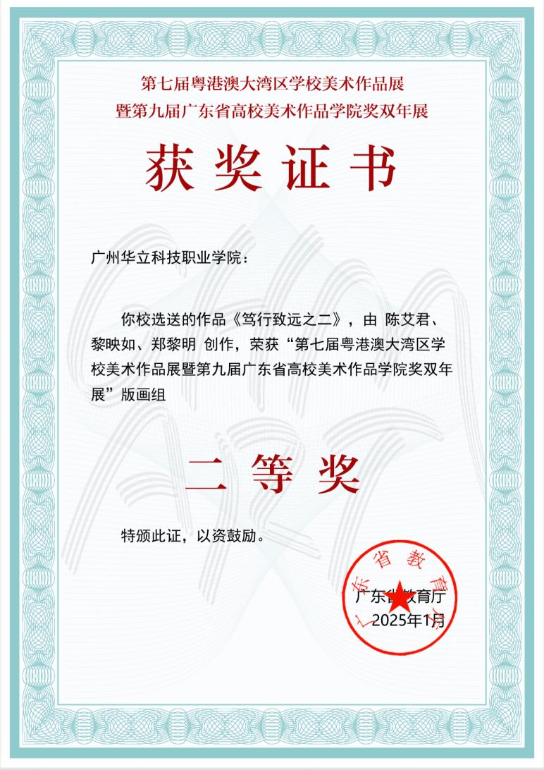 近日,廣東省教育廳正式頒發(fā)了第七屆粵港澳大灣區(qū)學(xué)校美術(shù)作品展暨第九屆廣東省高校美術(shù)作品學(xué)院獎(jiǎng)雙年展的獲獎(jiǎng)證書(shū)。在此次盛會(huì)中,藝術(shù)與傳媒學(xué)院師生憑借出色的藝術(shù)表現(xiàn)力,斬獲 1 項(xiàng)二等獎(jiǎng)與 1 項(xiàng)三等獎(jiǎng),充分彰顯了學(xué)院在藝術(shù)教育領(lǐng)域所取得的卓越成就。