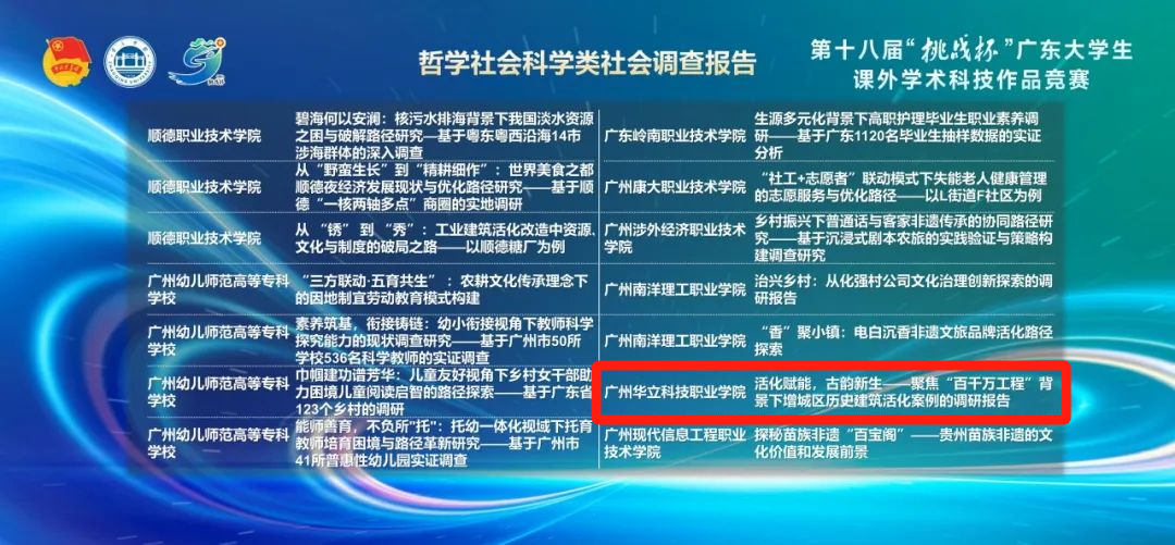 近日,我校藝術(shù)與傳媒學(xué)院劉嘉怡、陳改梅、宋依謎老師共同指導(dǎo)下,由王可欣、梁嘉雯、林燕津等學(xué)生共同完成的《活化賦能,古韻新生——聚焦“百千萬工程”背景下增城區(qū)歷史建筑活化案例的調(diào)研報(bào)告》在廣東省第十八屆“挑戰(zhàn)杯”大學(xué)生課外學(xué)術(shù)科技作品競(jìng)賽決賽中斬獲二等獎(jiǎng),充分展現(xiàn)了我校青年學(xué)子以專業(yè)所學(xué)服務(wù)鄉(xiāng)村振興戰(zhàn)略的責(zé)任擔(dān)當(dāng)與創(chuàng)新實(shí)踐。