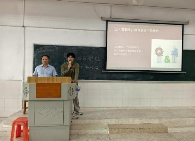 廖校長強調(diào),職業(yè)教育是與普通教育同等重要的教育類型,是國民教育體系和人力資源開發(fā)的重要組成部分。高職畢業(yè)生占新增就業(yè)人口70%,制造業(yè)一線技術(shù)骨干80%來自高職,職業(yè)教育已成為教育強國的“半壁江山”,職業(yè)教育大有可為。在互動環(huán)節(jié),他提出“作為高職學生,你認為自己在教育強國中能扮演什么角色”等問題,引發(fā)學生深思。他引用習近平總書記的青年寄語:“青年一代有理想、有本領(lǐng)、有擔當,國家就有前途,民族就有希望”,鼓勵學生立大志、明大德、成大才,將個人成長融入國家發(fā)展。