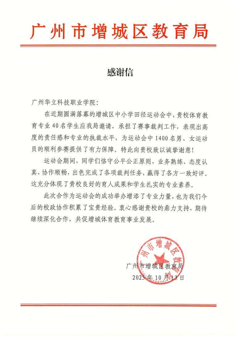近日,我校藝術(shù)與傳媒學(xué)院收到來(lái)自增城區(qū)教育局的感謝信,對(duì)學(xué)院48名體育教育專(zhuān)業(yè)學(xué)生在“廣州市增城區(qū)中小學(xué)田徑運(yùn)動(dòng)會(huì)”中擔(dān)任裁判員所展現(xiàn)出的專(zhuān)業(yè)素養(yǎng)與敬業(yè)精神表示高度贊揚(yáng)和誠(chéng)摯感謝。此前,這批學(xué)子于2025年9月28日至30日受增城區(qū)教育局正式邀請(qǐng),為運(yùn)動(dòng)會(huì)中1400名男、女運(yùn)動(dòng)員提供賽事執(zhí)裁服務(wù),同時(shí)他們以嚴(yán)謹(jǐn)?shù)膽B(tài)度、公正的判罰和出色的團(tuán)隊(duì)協(xié)作,贏得主辦方與參賽師生的一致好評(píng)。
