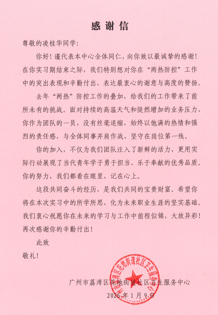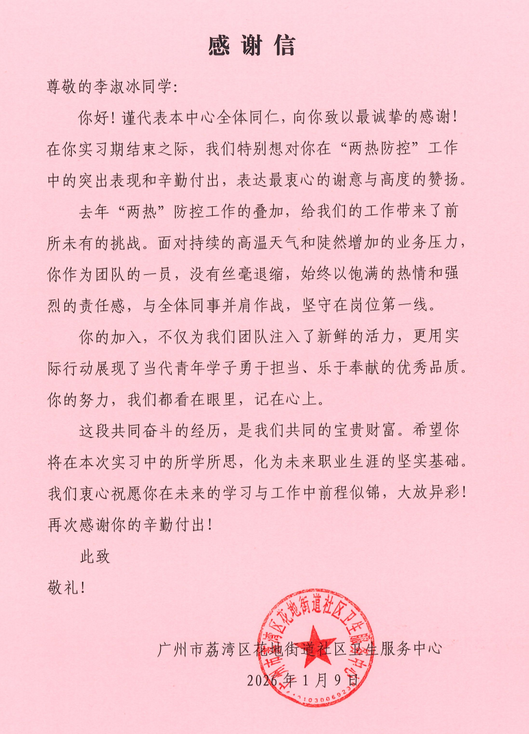 近日,廣州市荔灣區(qū)花地街道社區(qū)衛(wèi)生服務中心正式向我校中醫(yī)藥學院發(fā)來三封感謝信,對 2023 級實習生李淑冰(23 中醫(yī) 17 班)、凌桂華(23 中醫(yī) 17 班)、李梓恒(23 藥學 6 班)在基層實習期間的優(yōu)異表現(xiàn)給予高度評價與特別表揚,充分肯定了三位學子的職業(yè)素養(yǎng)與實踐能力。
