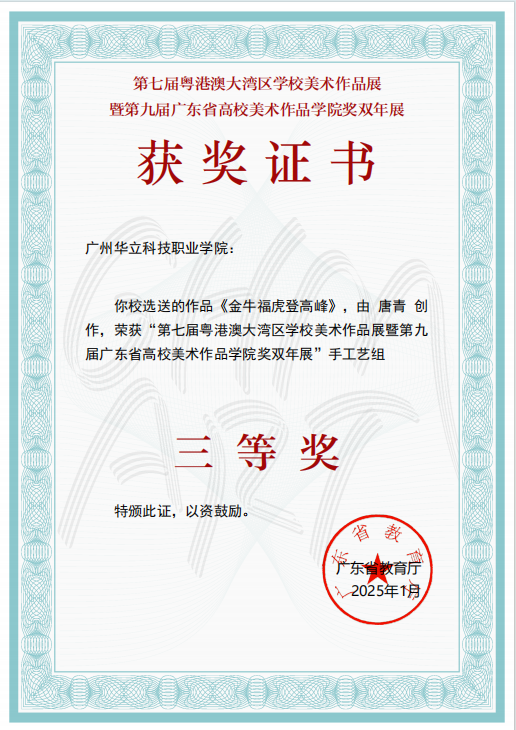一、2025年1月,廣東省教育廳頒發(fā)了第七屆粵港澳大灣區(qū)學校美術(shù)作品展暨第九屆廣東省高校美術(shù)作品學院獎雙年展的獲獎證書。其中,陳艾君、黎映如、鄭黎明三位教師共同創(chuàng)作的版畫作品《篤行致遠之二》榮獲“二等獎”,唐青教師的作品《金牛福虎登高峰》則榮獲“三等獎”。這些榮譽不僅是對教師個人藝術(shù)造詣的高度肯定,更凸顯了學院教師在藝術(shù)創(chuàng)作上風格多元、勇于創(chuàng)新的特質(zhì)。