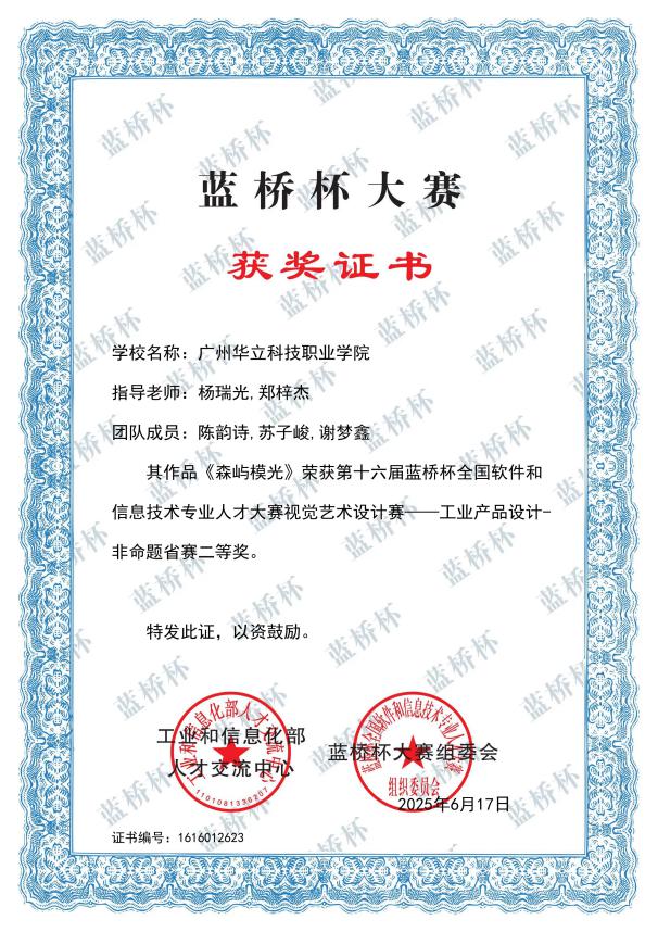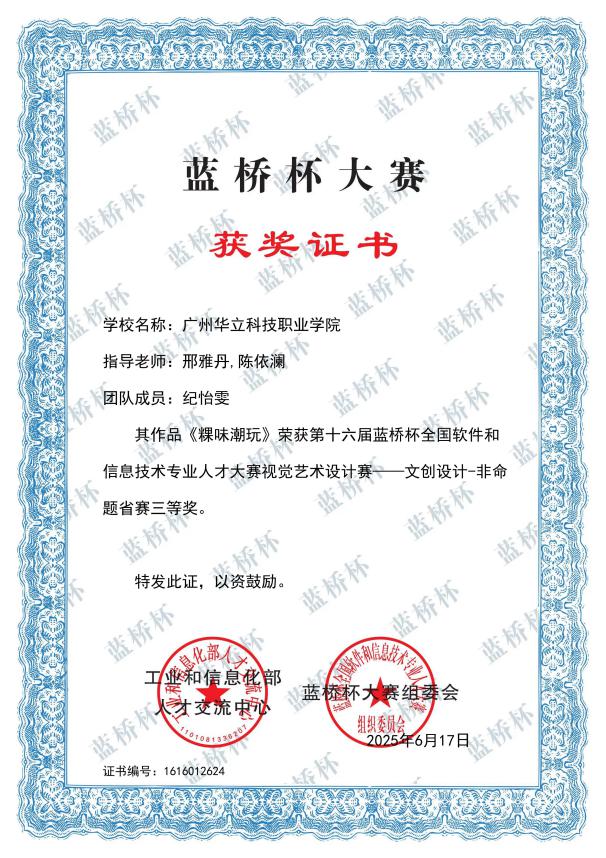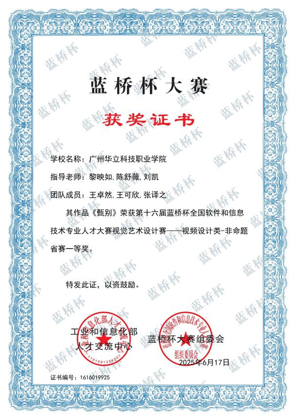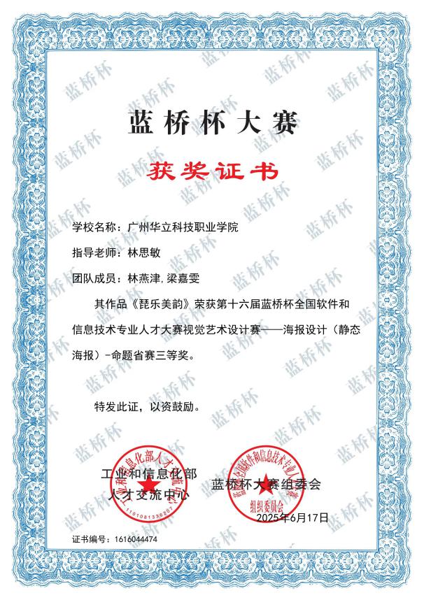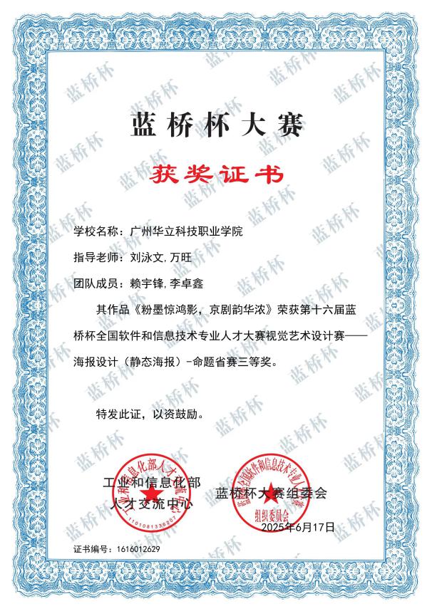 四、2025年6月,“藍橋杯全國軟件和信息技術(shù)專業(yè)人才大賽”由工業(yè)和信息化部人才交流中心主辦,連續(xù)多年入選中國高等教育學會“全國普通高校學科競賽排行榜”。本屆大賽省賽在全國31個省市自治區(qū)舉辦,來自北京大學、清華大學、復(fù)旦大學、上海交通大學等1900多所高校的23萬名選手同臺競技。在第十六屆“藍橋杯?視覺藝術(shù)設(shè)計大賽”藝術(shù)與傳媒學院學子斬獲“一等獎”2項、“二等獎”1項、“三等獎”5項。