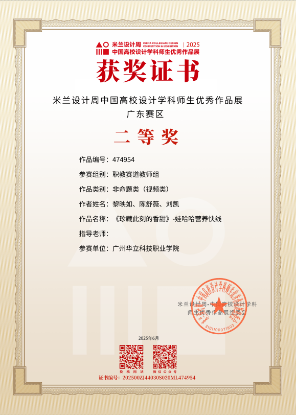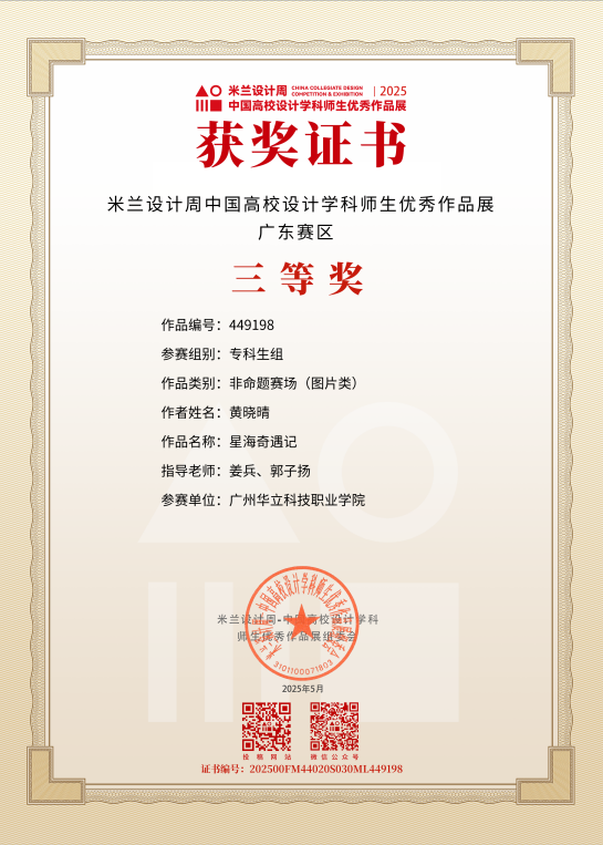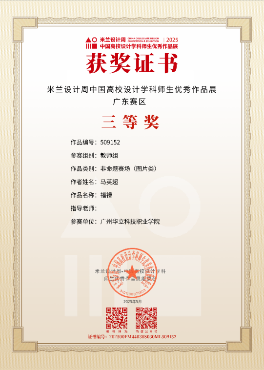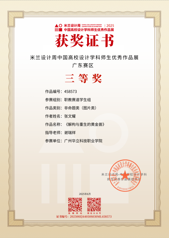 三、2025年5月,“米蘭設(shè)計周·中國高校設(shè)計學科師生優(yōu)秀作品展”由中國教育國際交流協(xié)會、中國高等教育學會聯(lián)合主辦,是教育部《全國普通高校學科競賽排行榜》重點賽事之一。賽事吸引了全國近千所高校參與,賽事旨在搭建國際化交流平臺,推動設(shè)計學科教學與實踐的深度融合,助力中國設(shè)計走向世界。在第九屆“米蘭設(shè)計周·中國高校設(shè)計學科師生優(yōu)秀作品展”藝術(shù)與傳媒學院師生榮獲“二等獎”1項、“三等獎”7項,充分展現(xiàn)了藝傳學院在設(shè)計教育領(lǐng)域“以賽促教、以文化人”的育人成果與師生團隊的卓越風采。