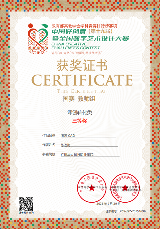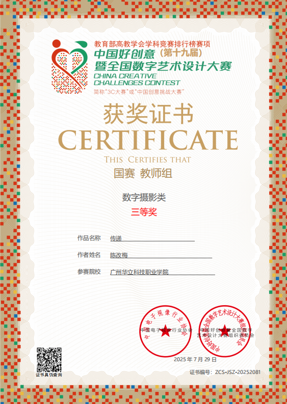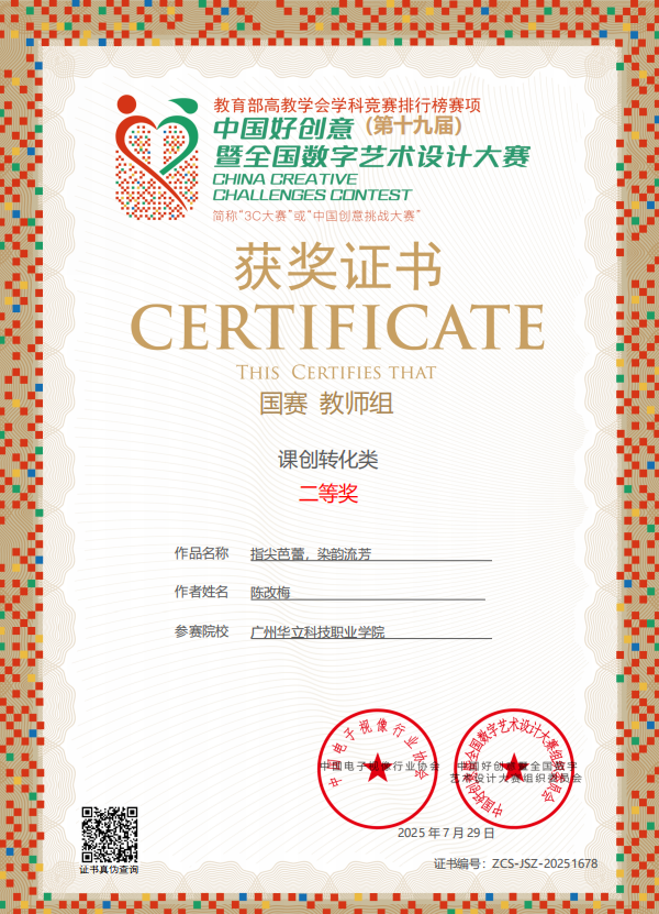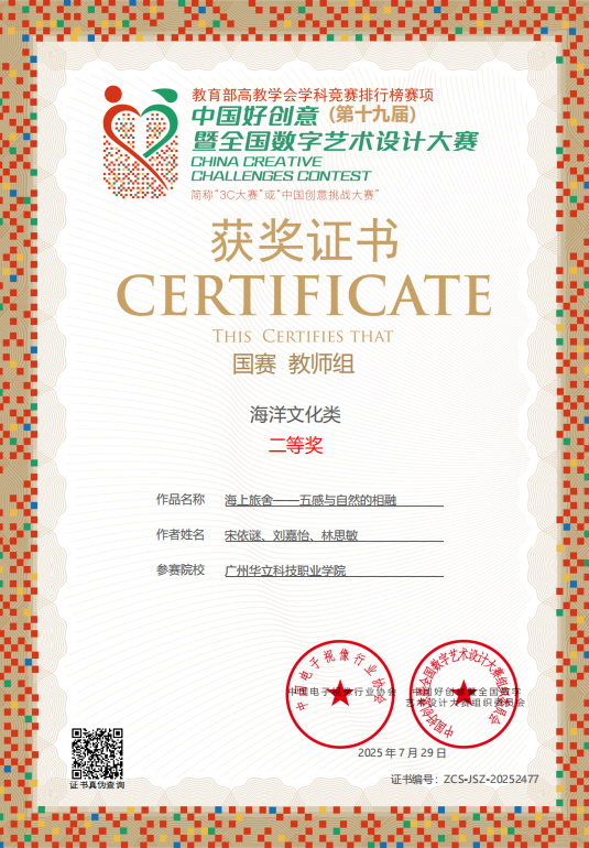 七、2025年7月,中國好創(chuàng)意暨全國數(shù)字藝術(shù)設(shè)計大賽,簡稱“中國創(chuàng)意挑戰(zhàn)大賽”,是教育部中國高等教育學會《全國普通高校學科競賽分析報告》收錄的權(quán)威賽事。作為國內(nèi)首個以數(shù)字藝術(shù)為核心、將賽事提升至哲學高度,并提供投稿免費存證服務(wù)的專業(yè)競賽,吸引眾多高校參與,影響力廣泛,已成為高校藝術(shù)創(chuàng)意領(lǐng)域的重要風向標。第十九屆中國好創(chuàng)意暨全國數(shù)字藝術(shù)設(shè)計大賽藝術(shù)與傳媒學院教師斬獲國賽“一等獎”1項、“二等獎”3項、“三等獎”4項的優(yōu)異成績。充分彰顯我校教師在數(shù)字藝術(shù)創(chuàng)作、技術(shù)應(yīng)用與教學改革中的綜合實力。