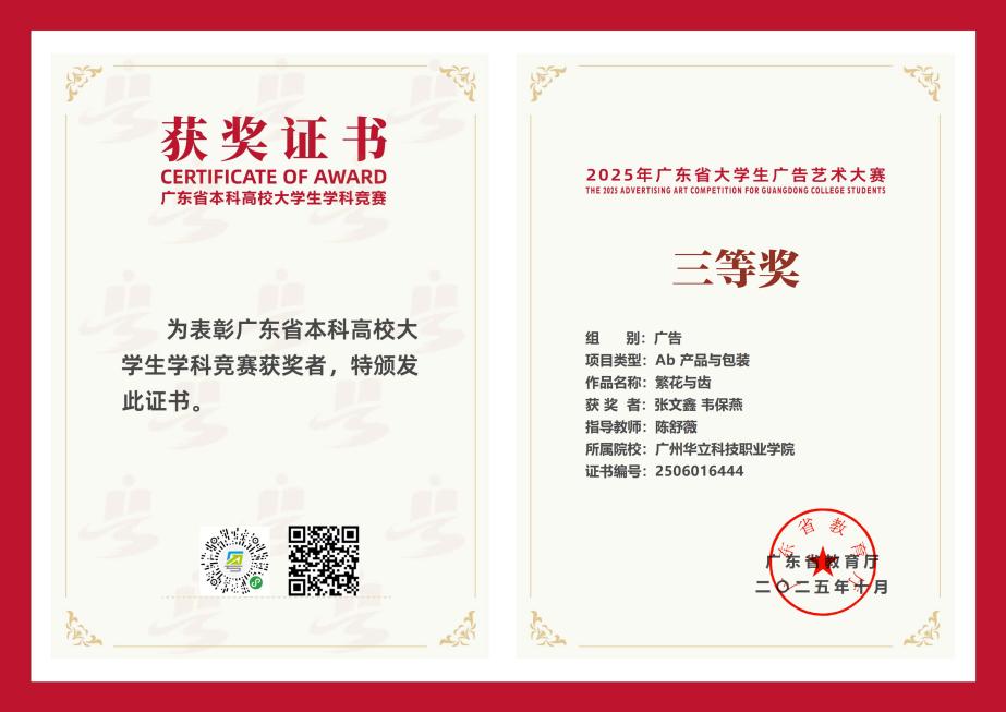 六、2025年7月,“全國大學生廣告藝術(shù)大賽”作為國內(nèi)規(guī)模龐大、覆蓋面廣、極具影響力的高校文科競賽,始終致力于激發(fā)大學生的創(chuàng)新活力與實踐能力。2025年第17屆全國大學生廣告藝術(shù)大賽(大廣賽)廣東賽區(qū)藝術(shù)與傳媒學院選送作品中《繁花與齒》在產(chǎn)品與包裝設(shè)計類別中脫穎而出,其創(chuàng)意構(gòu)思與視覺呈現(xiàn)獲得了賽事評委的高度認可,成功斬獲省級“三等獎”。