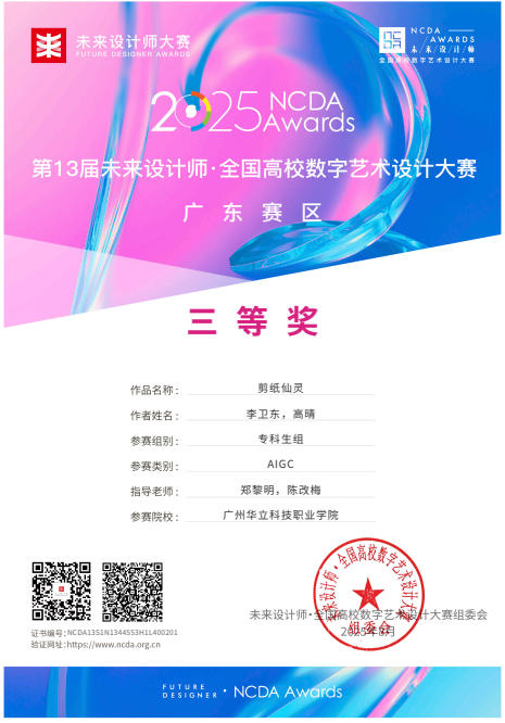 九、2025年8月,未來設(shè)計師·全國高校數(shù)字藝術(shù)設(shè)計大賽(NCDA)是入選《全國普通高校大學生競賽排行榜》,近20家省教育廳認定,“學習強國”學習平臺支持,對接聯(lián)合國國際賽的全國性大學生競賽。是高校教育教學改革和創(chuàng)新人才培養(yǎng)的重要競賽項目之一,具有極高的知名度與影響力。在第13屆未來設(shè)計師·全國高校數(shù)字藝術(shù)設(shè)計大賽(NCDA)中,藝術(shù)與傳媒學院師生在廣東省賽區(qū)共獲獎12項。其中,我校獲得優(yōu)秀組織單位獎1項;學生組“一等獎”2項,“三等獎”2項;教師組“一等獎”1項,“三等獎”1項;“優(yōu)秀指導(dǎo)教師獎”4項;“優(yōu)秀組織教師獎”1項。