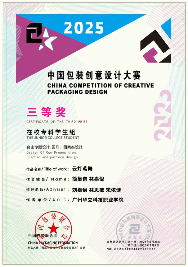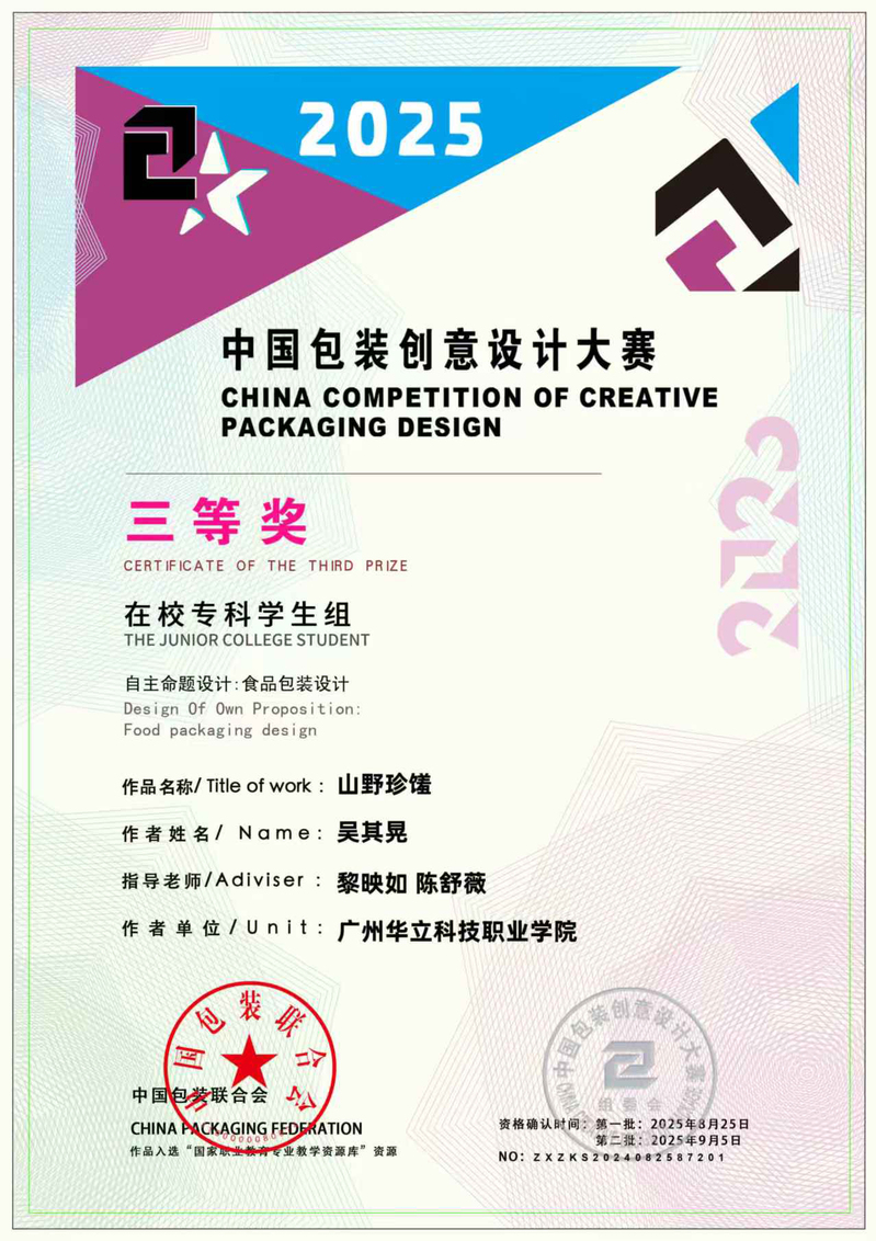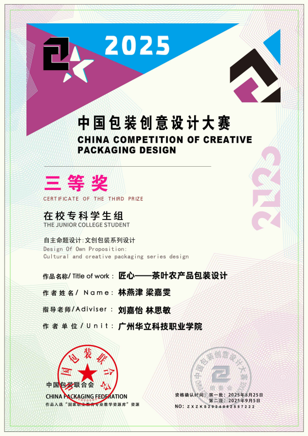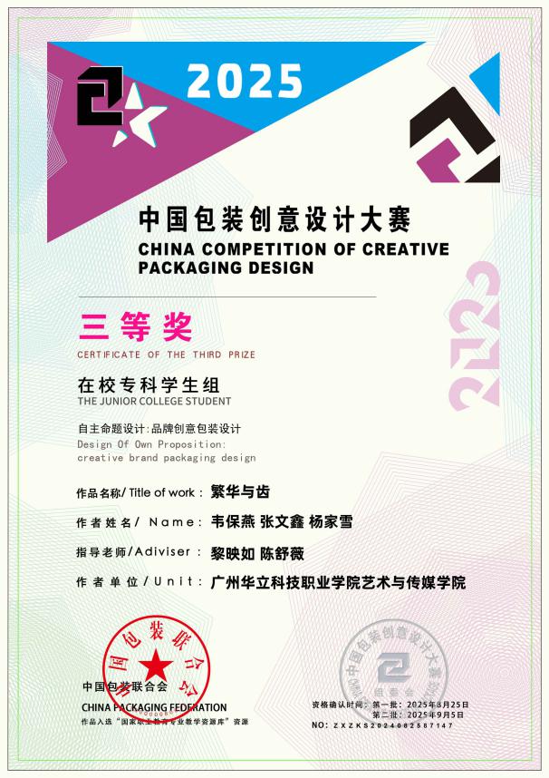 八、2025年8月,中國包裝創(chuàng)意設(shè)計大賽是由中國包裝聯(lián)合會主辦的國家級權(quán)威賽事,涵蓋工業(yè)生產(chǎn)、行業(yè)標準、包裝教育、智能制造與先進設(shè)計等多個領(lǐng)域,面向全球設(shè)計愛好者及院校師生,已成為我國包裝與設(shè)計教育界具有廣泛影響力的專業(yè)競賽平臺。大賽優(yōu)秀作品亦納入教育部國家職業(yè)教育專業(yè)教學資源庫建設(shè)。2025中國包裝創(chuàng)意設(shè)計大賽,藝術(shù)與傳媒學院學生作品共斬獲國家級“三等獎”5項、“優(yōu)秀獎”6項,充分展現(xiàn)了藝術(shù)與傳媒學院在設(shè)計教育與創(chuàng)新實踐方面的扎實成效。