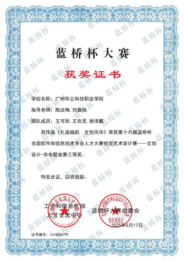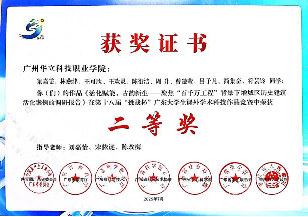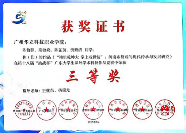 五、2025年7月,在廣東省第十八屆“挑戰(zhàn)杯”大學生課外學術(shù)科技作品競賽決賽中,藝傳師生斬獲“挑戰(zhàn)杯”省賽“二等獎”1項,“三等獎”1項,充分展現(xiàn)了藝傳學院青年學子以專業(yè)所學服務(wù)鄉(xiāng)村振興戰(zhàn)略的責任擔當與創(chuàng)新實踐,更展現(xiàn)了學校以產(chǎn)教融合助力“百千萬工程”的積極實踐,助力嶺南文化名片在新時代綻放光彩。