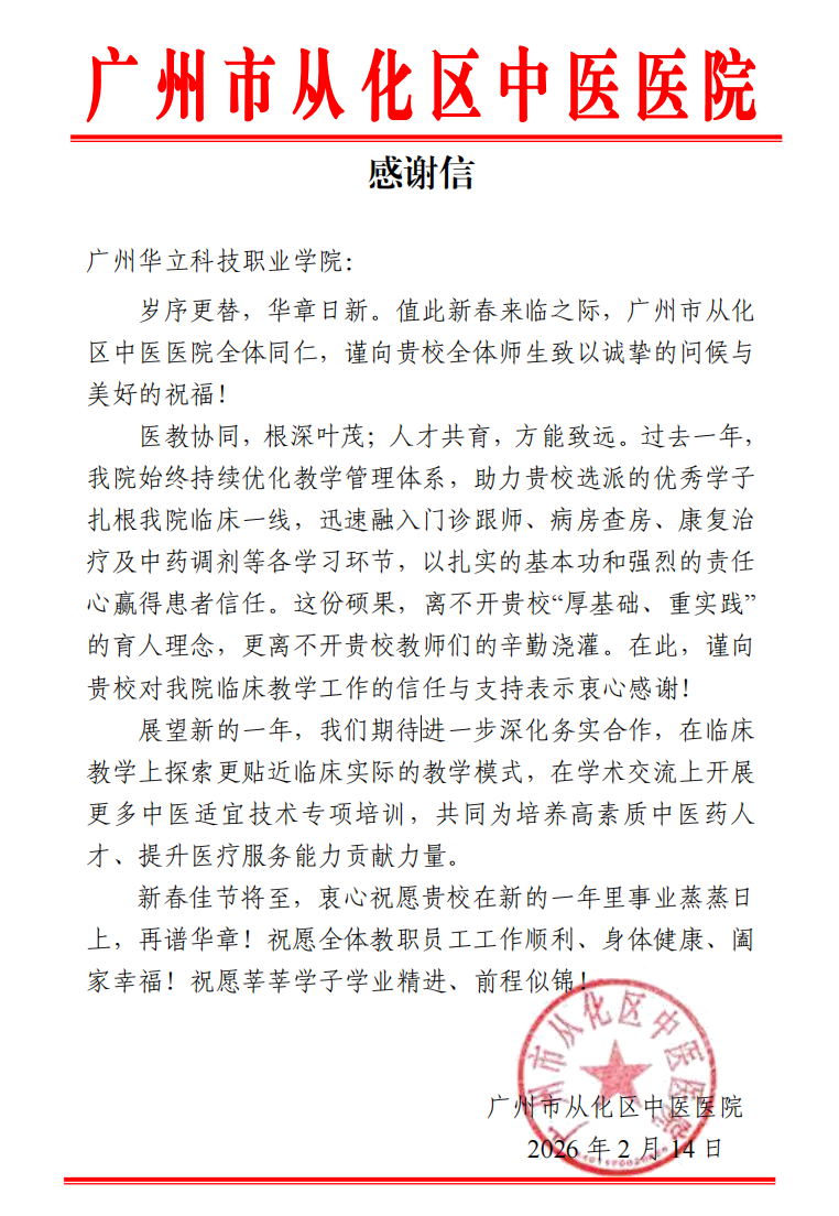 近日,我院收到來(lái)自廣州市從化區(qū)中醫(yī)醫(yī)院的一封真摯的感謝信。信中,醫(yī)院對(duì)我院選派的中醫(yī)藥學(xué)子在臨床實(shí)習(xí)中的優(yōu)異表現(xiàn)給予充分肯定,并對(duì)學(xué)院在人才培養(yǎng)方面的扎實(shí)工作表示衷心感謝。這份來(lái)自臨床一線的認(rèn)可,是我院堅(jiān)持“醫(yī)教協(xié)同、德術(shù)并修”育人理念的又一有力見(jiàn)證。