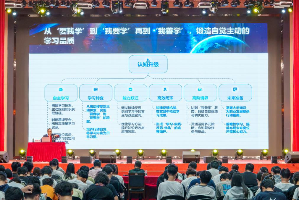 講座中,劉玉強教授圍繞“時代召喚”“為學方法”“思想格局”“實干擔當”四大維度展開系統(tǒng)闡述。他結(jié)合職業(yè)教育在強國建設(shè)中的戰(zhàn)略支撐作用,分析當前大學生應具備的學習意識與高校育人使命,通過真實行業(yè)案例剖析專業(yè)價值,引導同學們轉(zhuǎn)變學習觀念、掌握閉環(huán)學習方法、樹立扎根基層的奮斗意識,鼓勵大家立足專業(yè)、扎根基層,以青春力量助力國家建設(shè)。